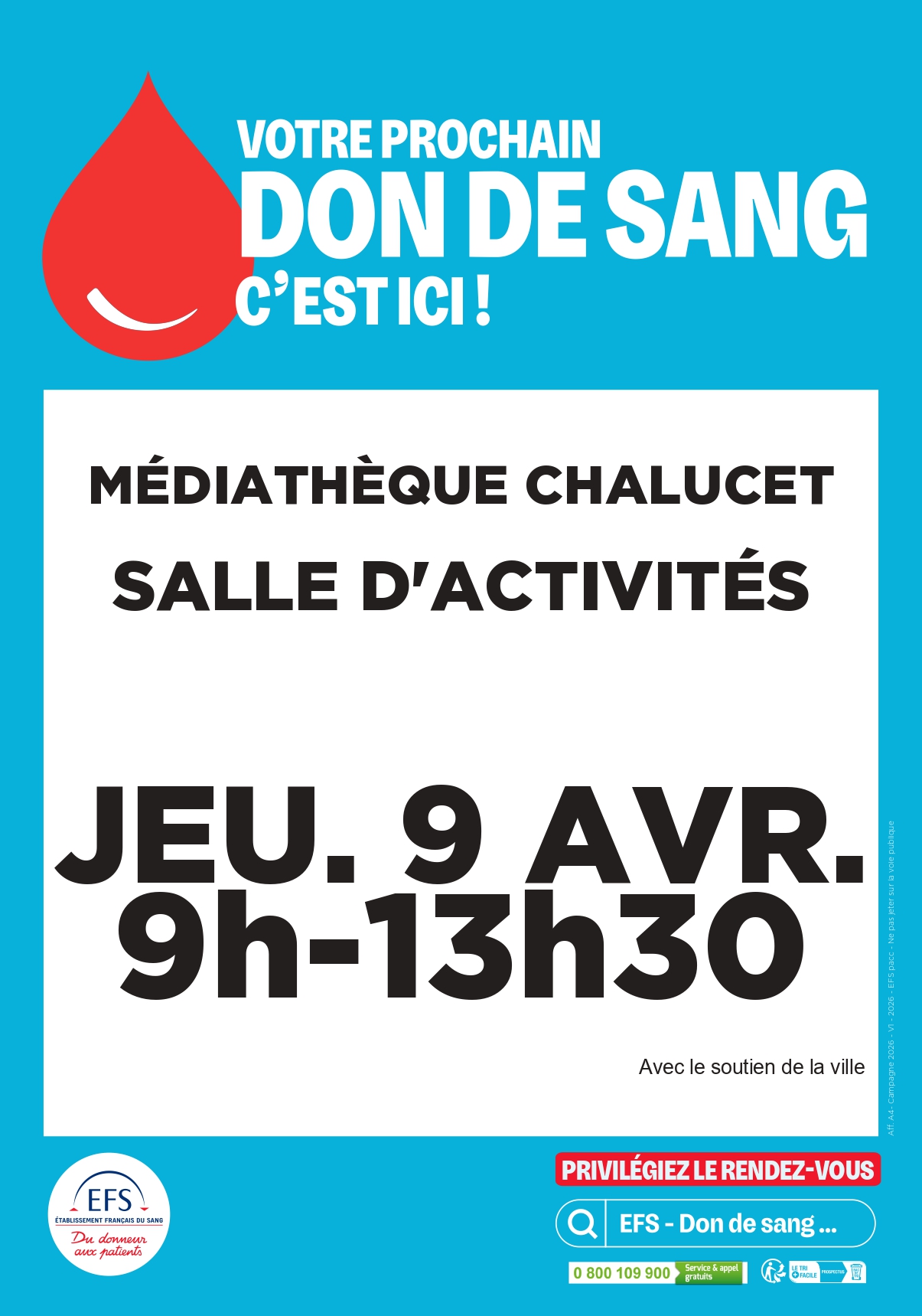 Gratuit. Prise de RDV obligatoire sur : https://dondesang.efs.sante.fr/trouver-une-collecte/148759/sang.