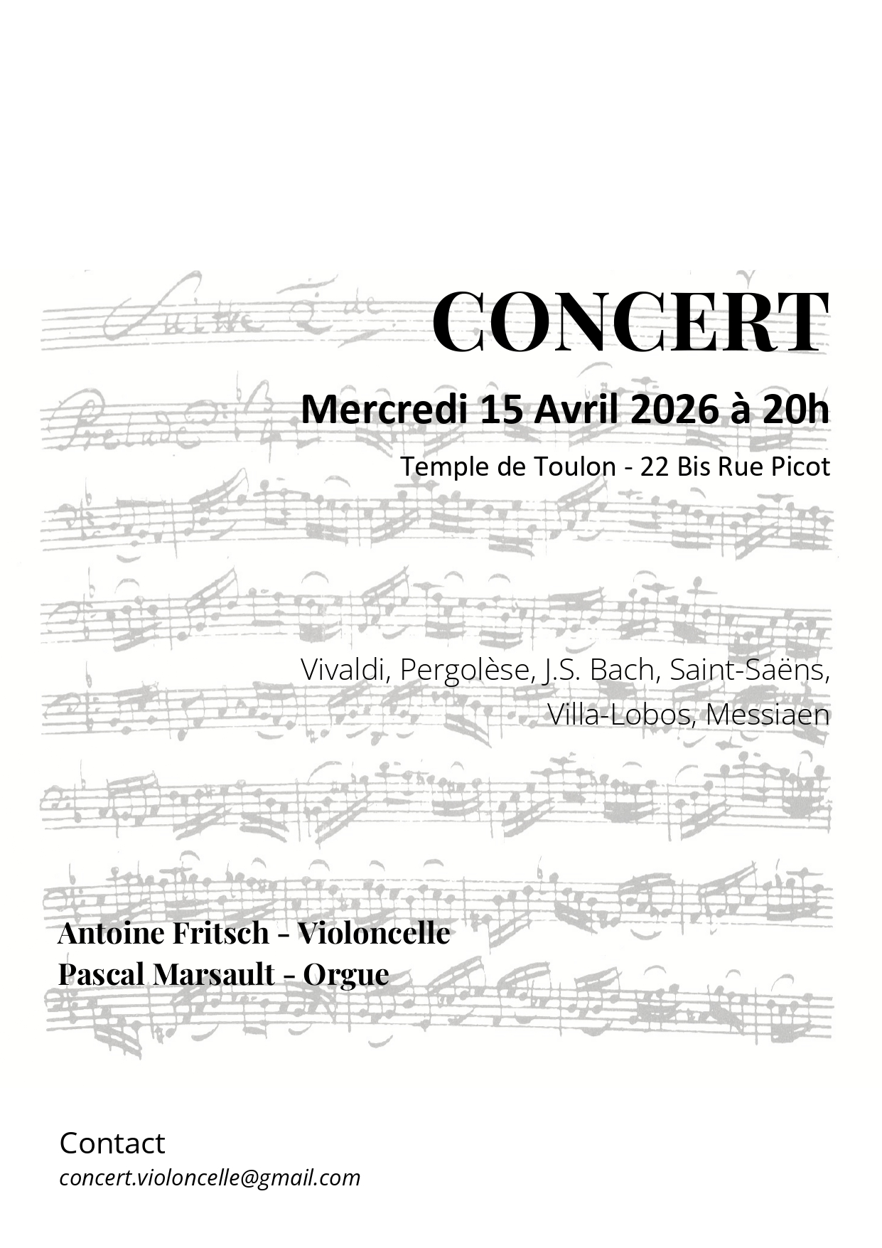 Avec Antoine Fritsch (violoncelle) et Pascal Marsault (orgue). Au programme : Vivaldi, Bach, Saint-Saëns, Villa-Lobos et Messiaen.