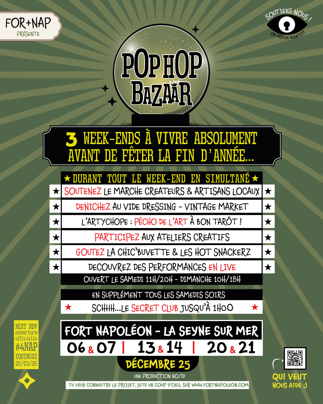 Das Fort Napoléon erwacht zum Jahresende und öffnet seine Pforten für ein völlig neues Ereignis: die POP HOP BAZAAR, ein herzliches und kreatives Treffen, das das Beste der lokalen Szene im Weitwinkelformat zusammenbringt.