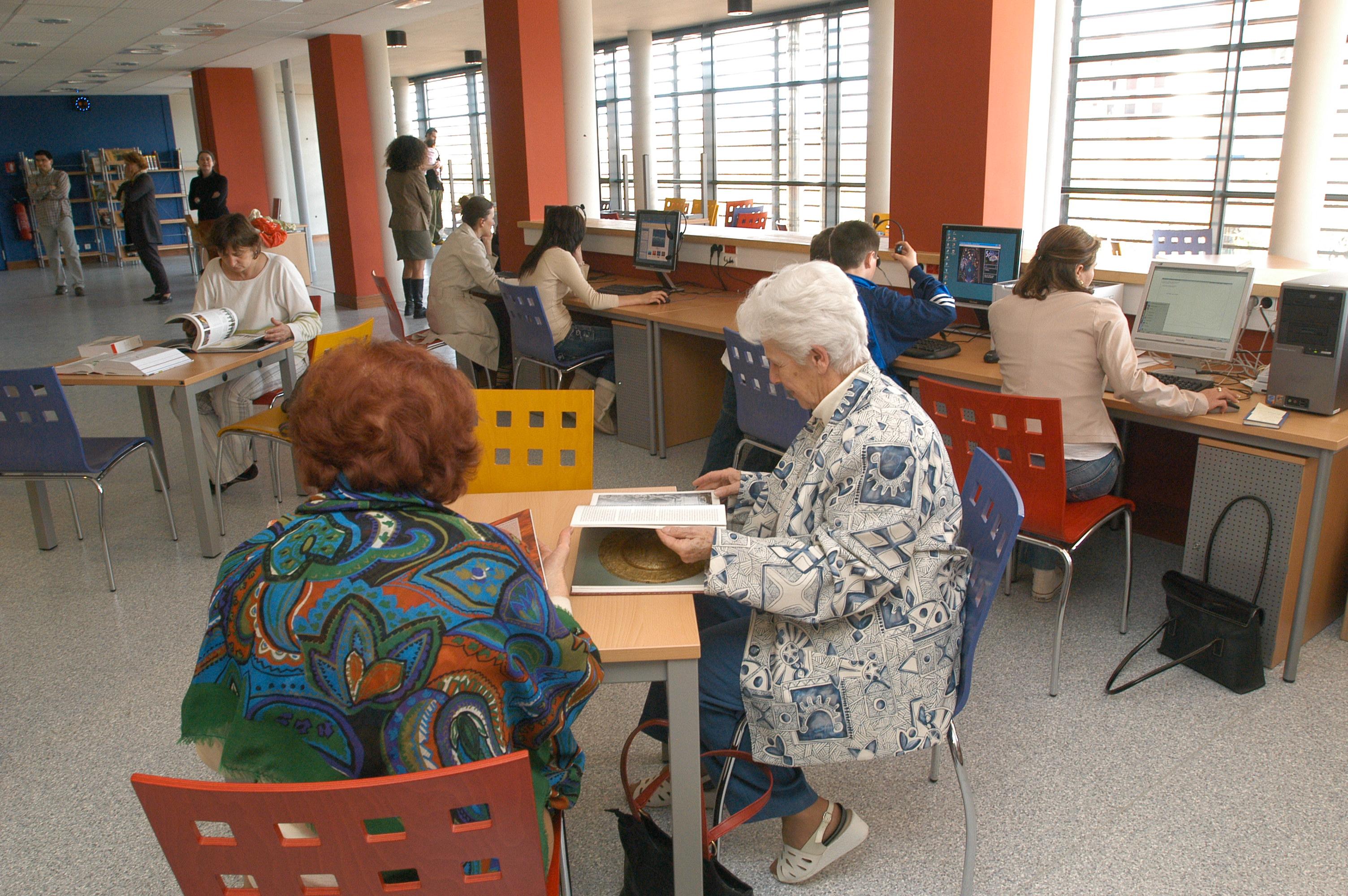 Kostenlose Nutzung der Dokumente vor Ort, Ausleihe nach Anmeldung: 85.000 Bücher, 12.000 DVDs, 200 Zeitschriftenabonnements.