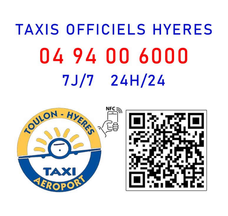 Les Taxis Hyérois ist ein Zusammenschluss von 19 Fahrzeugen. Sie bieten sehr flexible Taxidienste an und können Ihnen ein Taxi für einen ganzen Tag zur Verfügung stellen. Die Fahrer sind ortskundig und können Sie vom Flughafen zu Ihrem Zielort bringen, z. B. zum Tour Fondue, um auf die Insel Porquerolles zu gelangen. Individuelle Fahrten nach Toulon, Marseille, St. Tropez, Bormes, Nizza, Le Lavandou etc.
