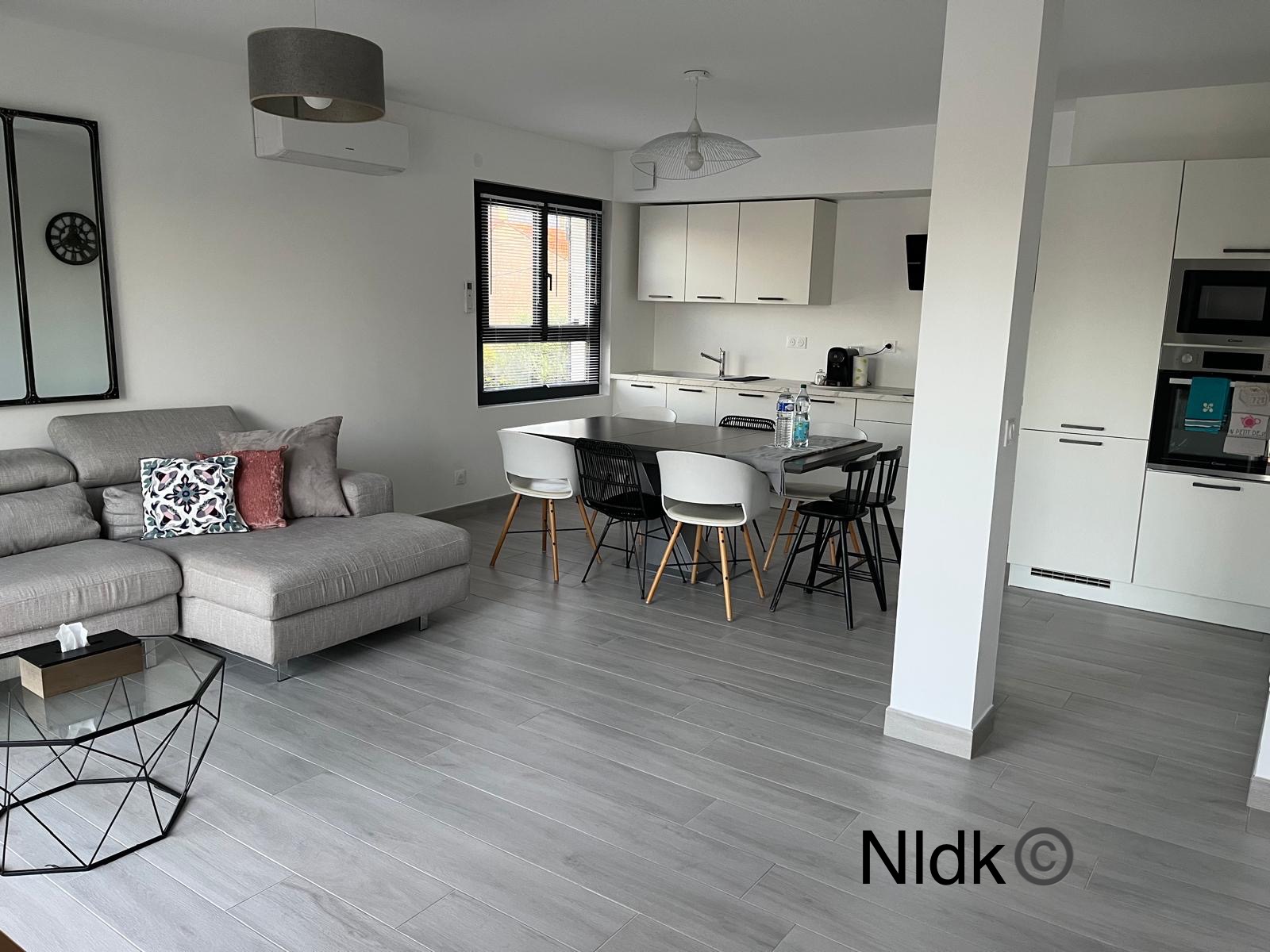 Ein helles Wohnzimmer mit voll ausgestatteter Küche und gemütlichem Wohnbereich.