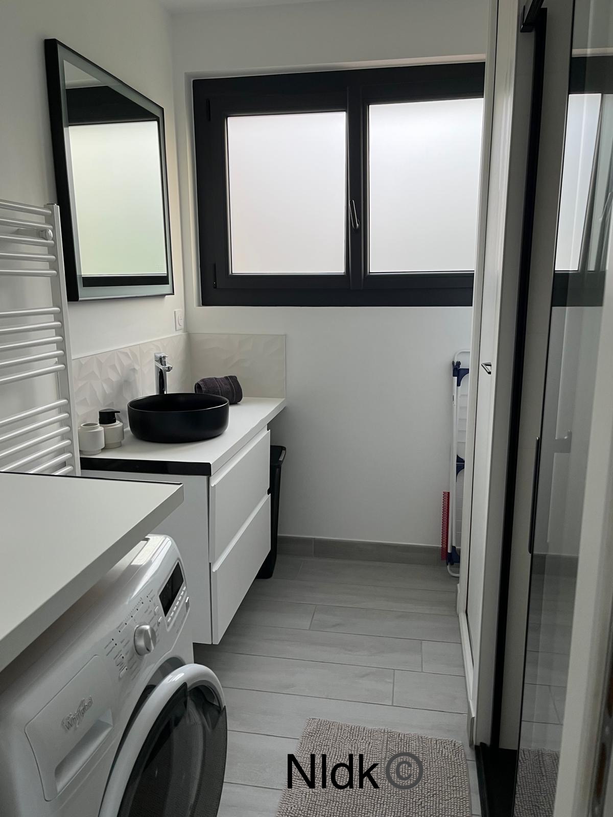 Praktisches Badezimmer mit Waschmaschine.