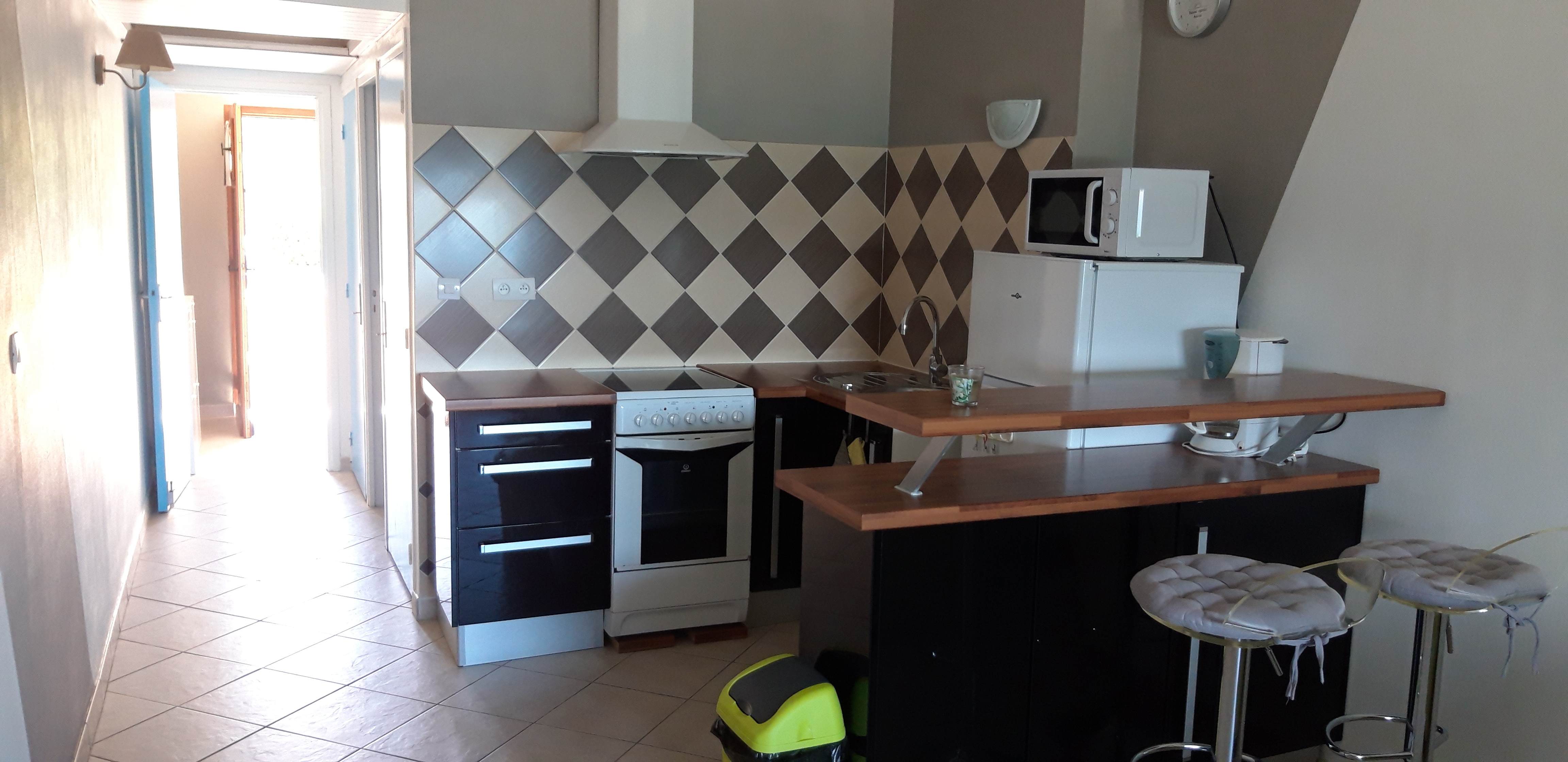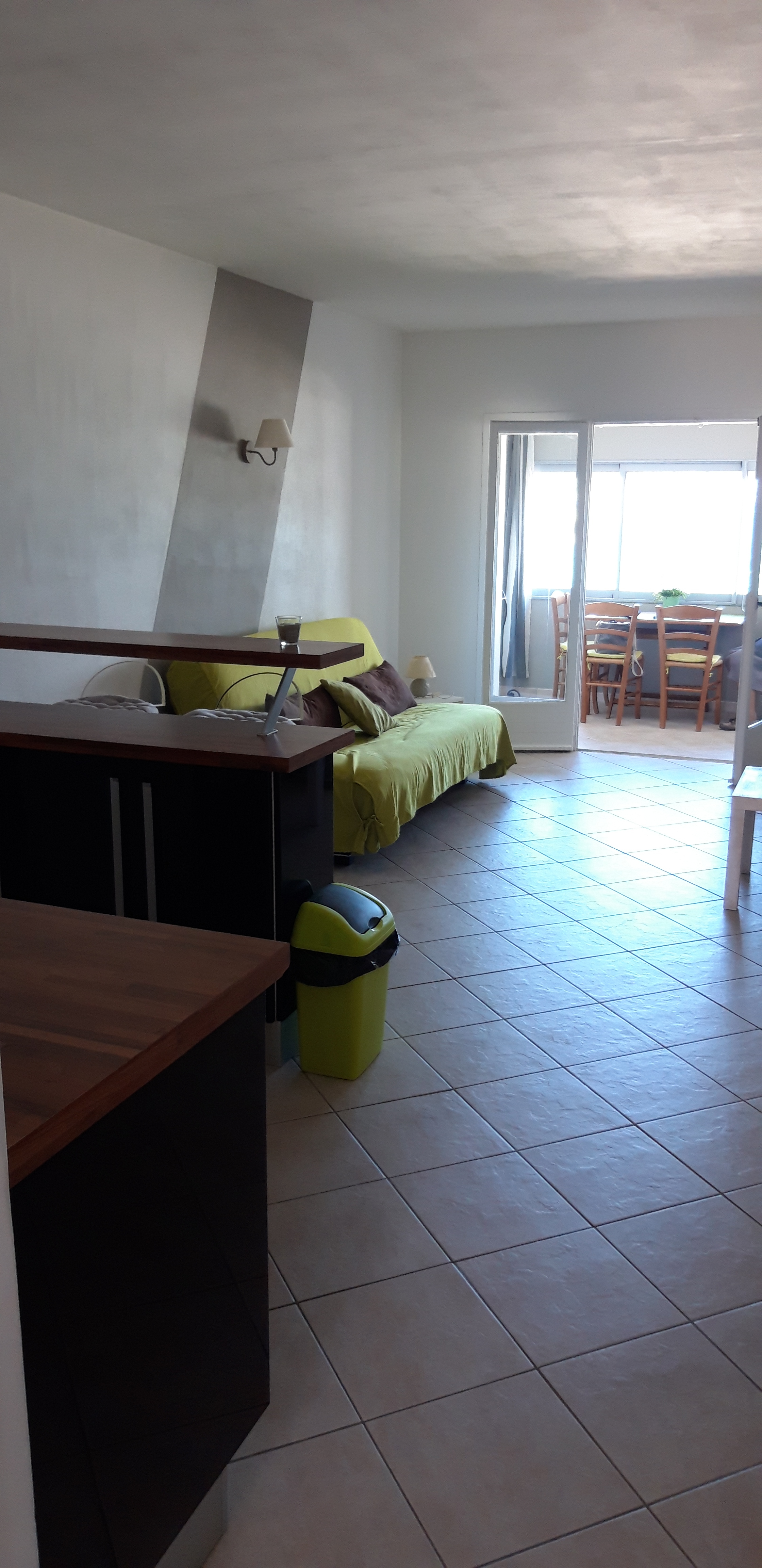 Beschreibung : Ein Schlafzimmer am Eingang (neue Bettwäsche 2 Pers.), Badezimmer (Dusche, Waschbecken, WC und Waschmaschine), großer Wohnraum mit ausgestatteter Küche (Glaskeramikherd, Backofen, Mikrowelle, Kühl-/Gefrierschrank, Kaffeemaschine, Toaster), Clic Clac 2 Pers. und TV, und Meerblick von der Loggia, die durch eine Fensterfront geschlossen ist.