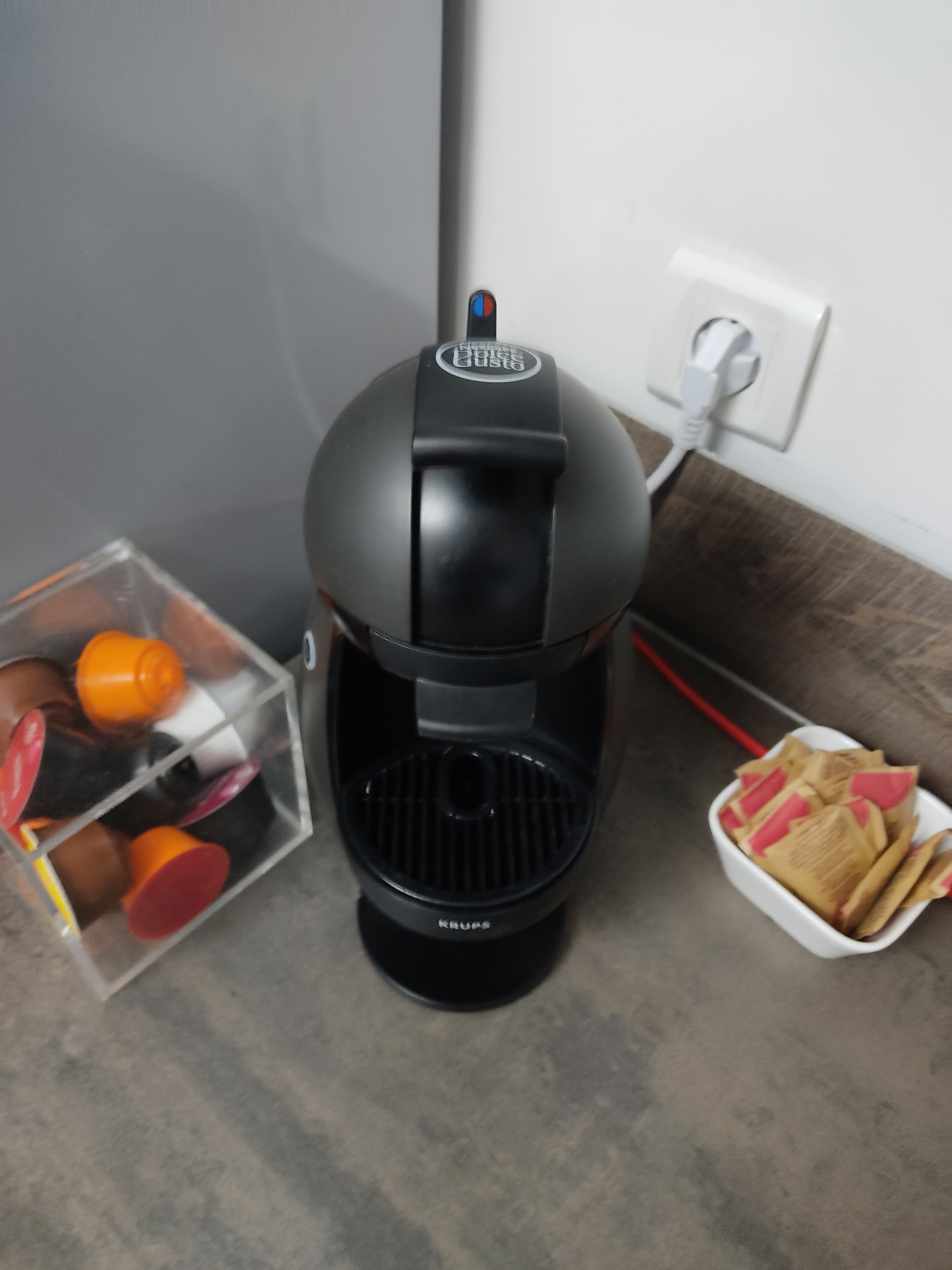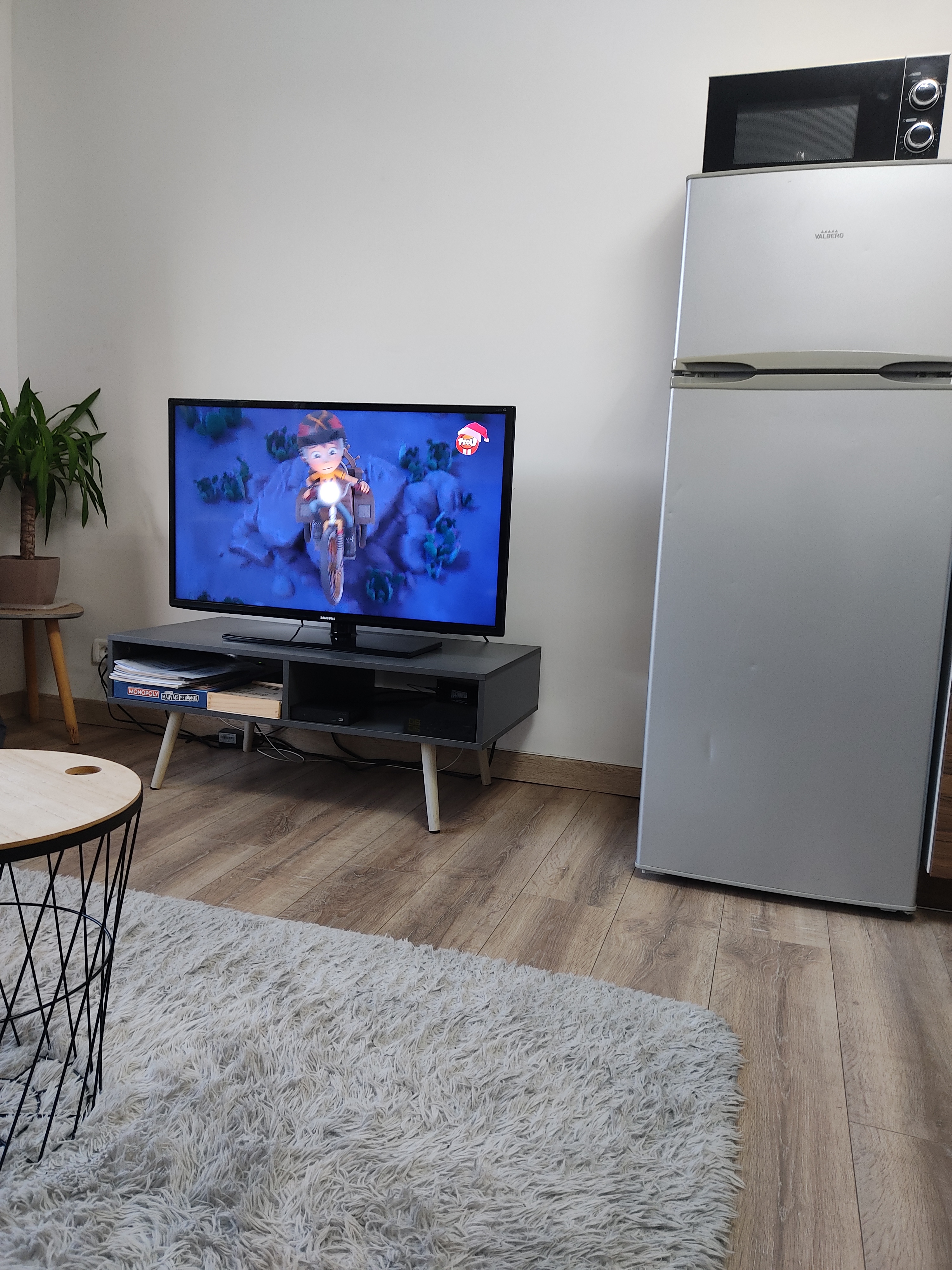 - Der Wohnraum besteht aus einem Wohnzimmer mit Wifi-Box, einer Küche mit Kaffeemaschine, Backofen, Kochplatte, Mikrowelle, Abzugshaube, Kühlschrank, Schränken sowie den notwendigen Utensilien zum Kochen, einem Schlafsofa, einem Fernseher und einem Esstisch für 4 Personen.