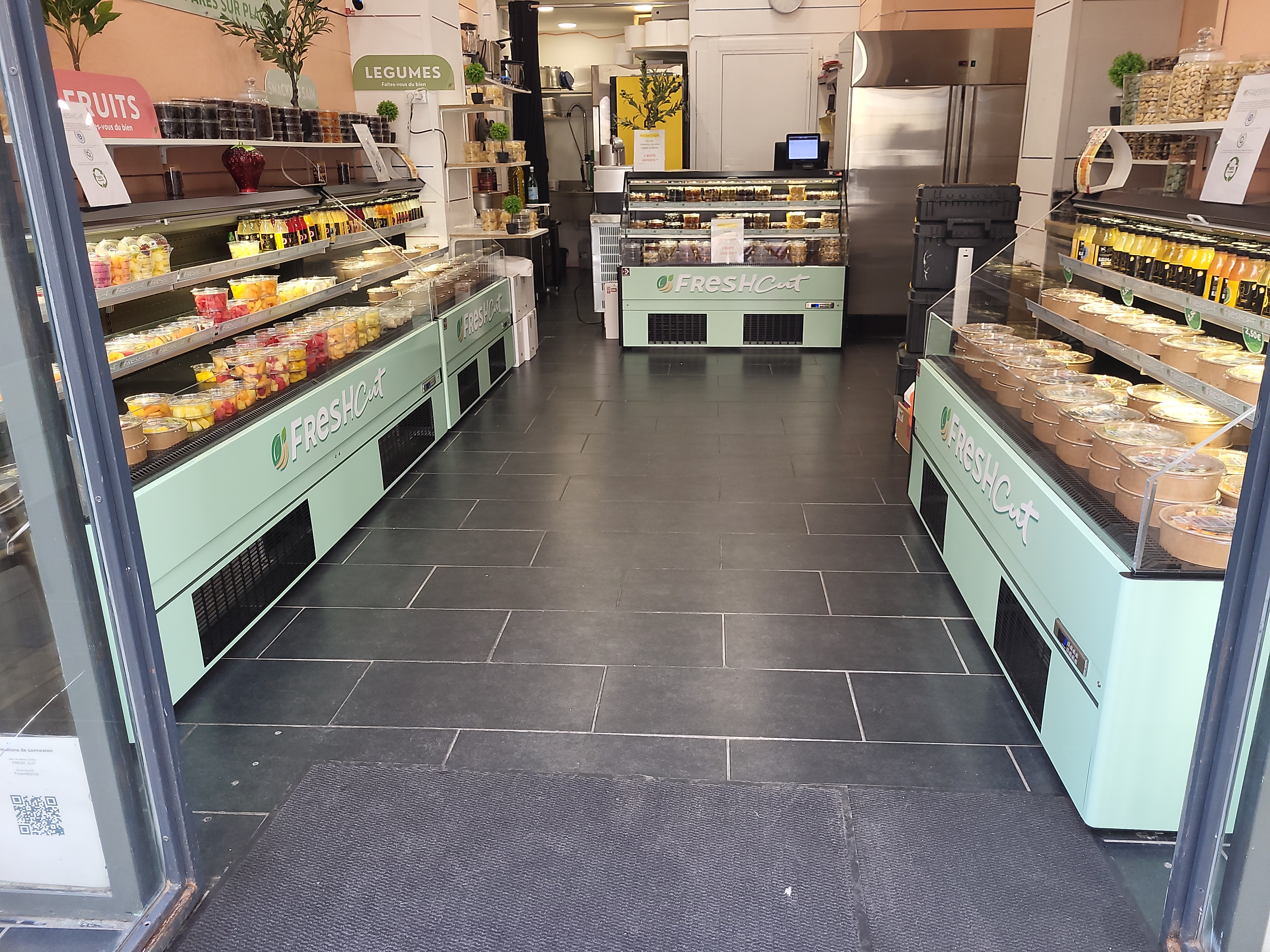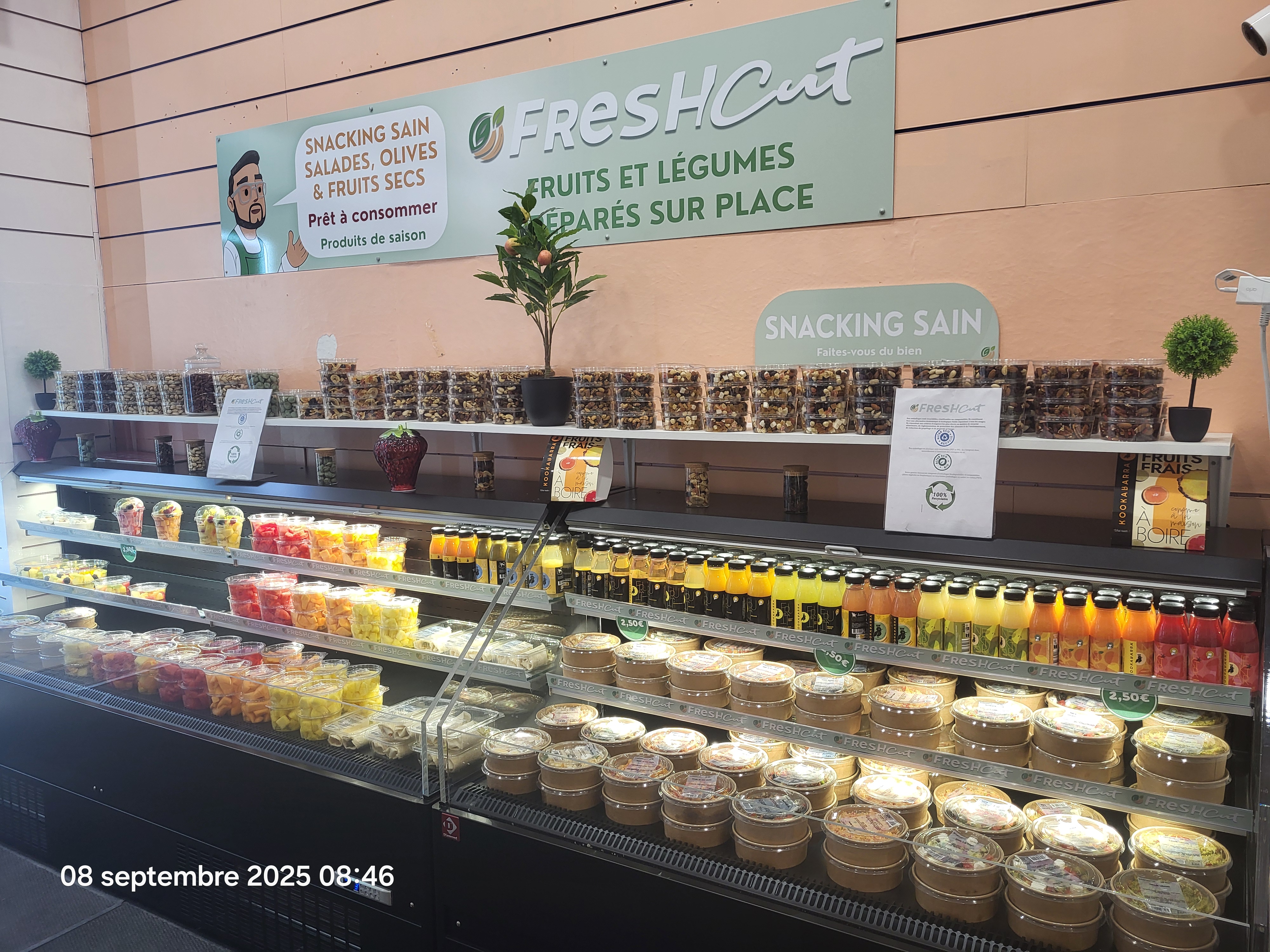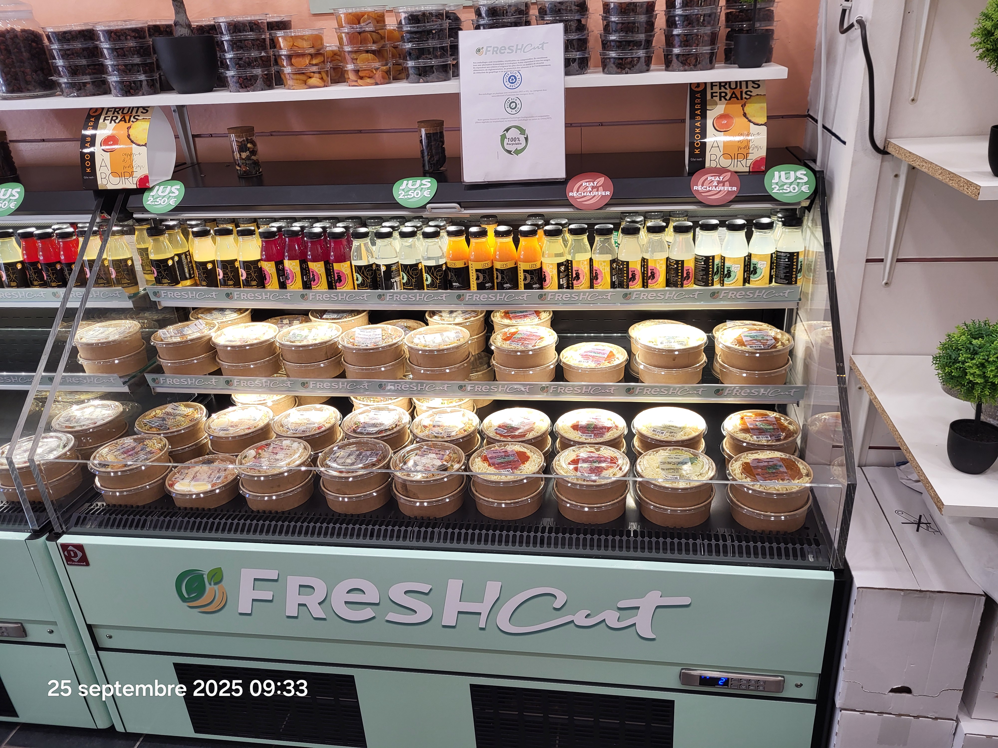 Fresh cut ist ein Geschäft, das sich auf frisches Schneiden von Obst, Gemüse und gesunden Snacks spezialisiert hat.