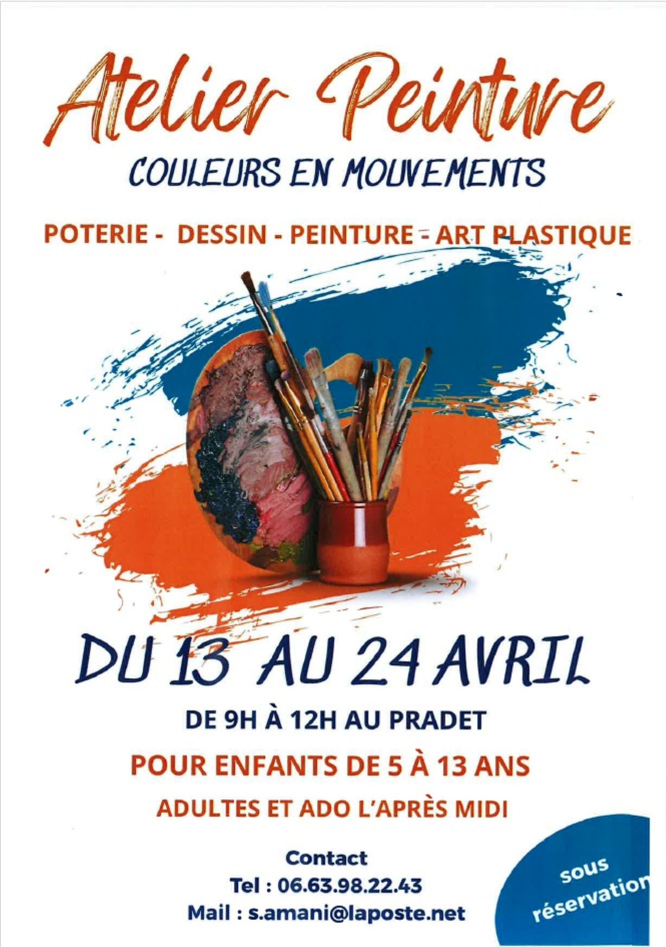 Painting, pottery, drawing and plastic arts workshops. Information and booking on 06 63 98 22 43