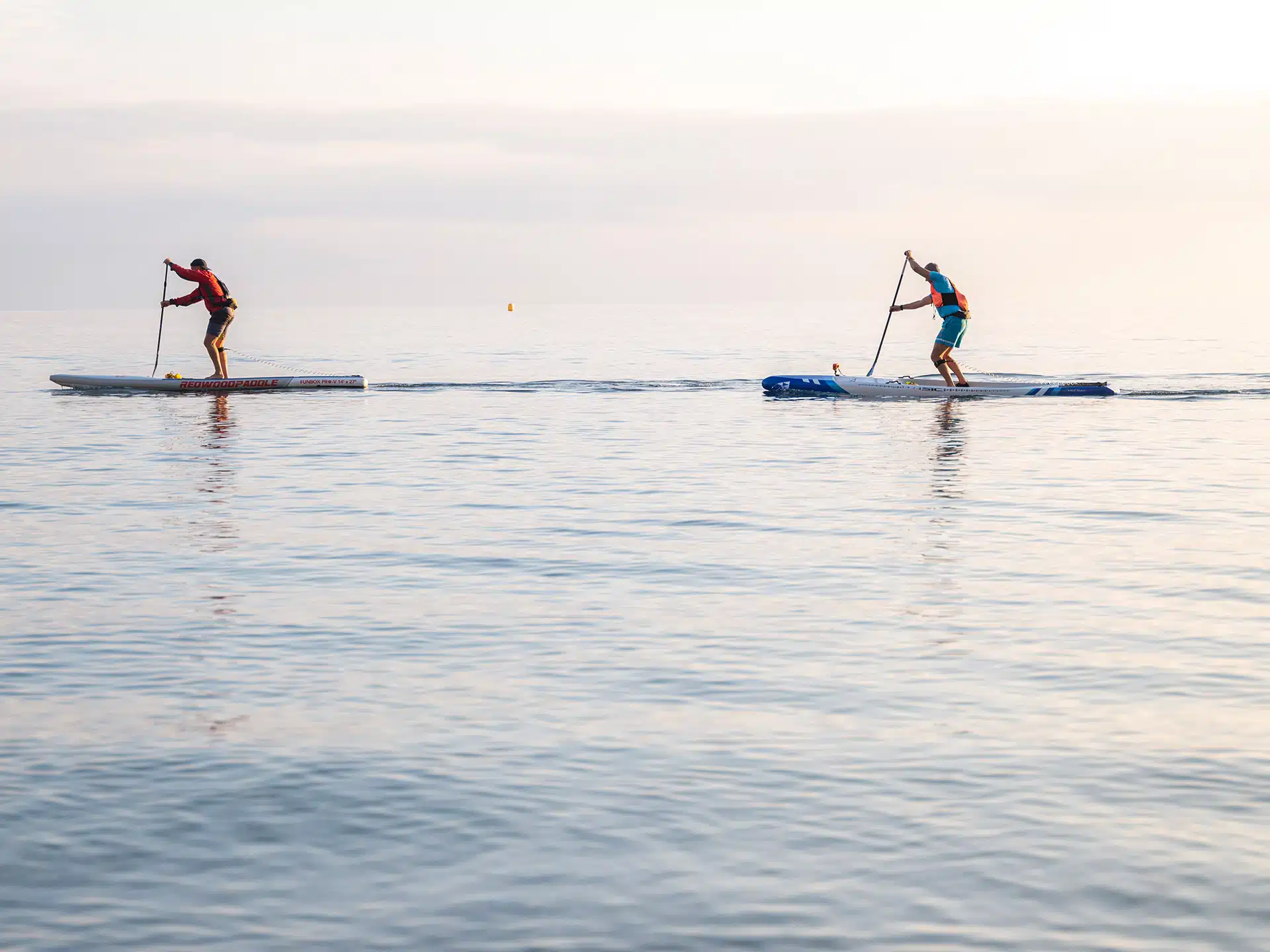 For the first 45 minutes, the group is divided into several teams to take part in a team-building challenge supervised by a Brevet d’État instructor using kayaks, paddles and a giant paddle.