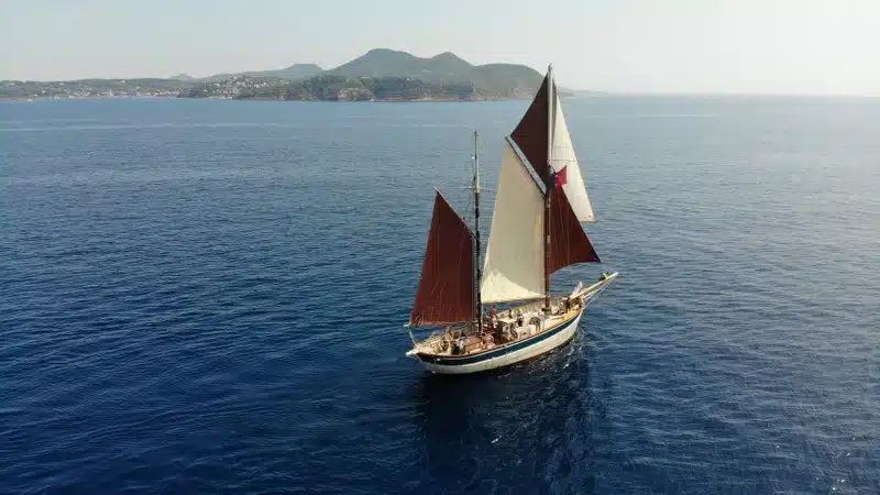 Robust and rustic enough to take on the sea, this former tuna fishing boat remains gentle and pleasant at sea. It combines comfort and safety for passengers. The large deck area is perfect for sunny siestas or watching the sailors maneuver. After sailing, the yacht drops anchor in a sheltered cove with crystal-clear waters, where you can swim, snorkel, kayak or simply relax and sunbathe.