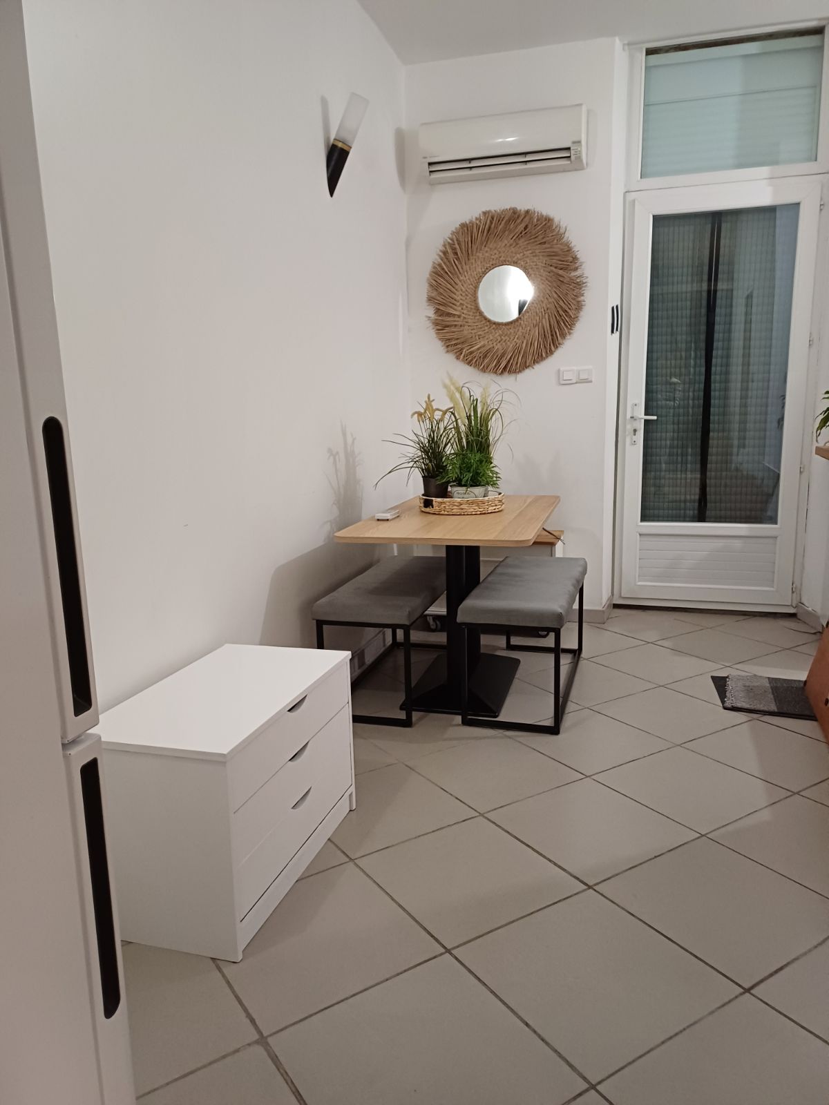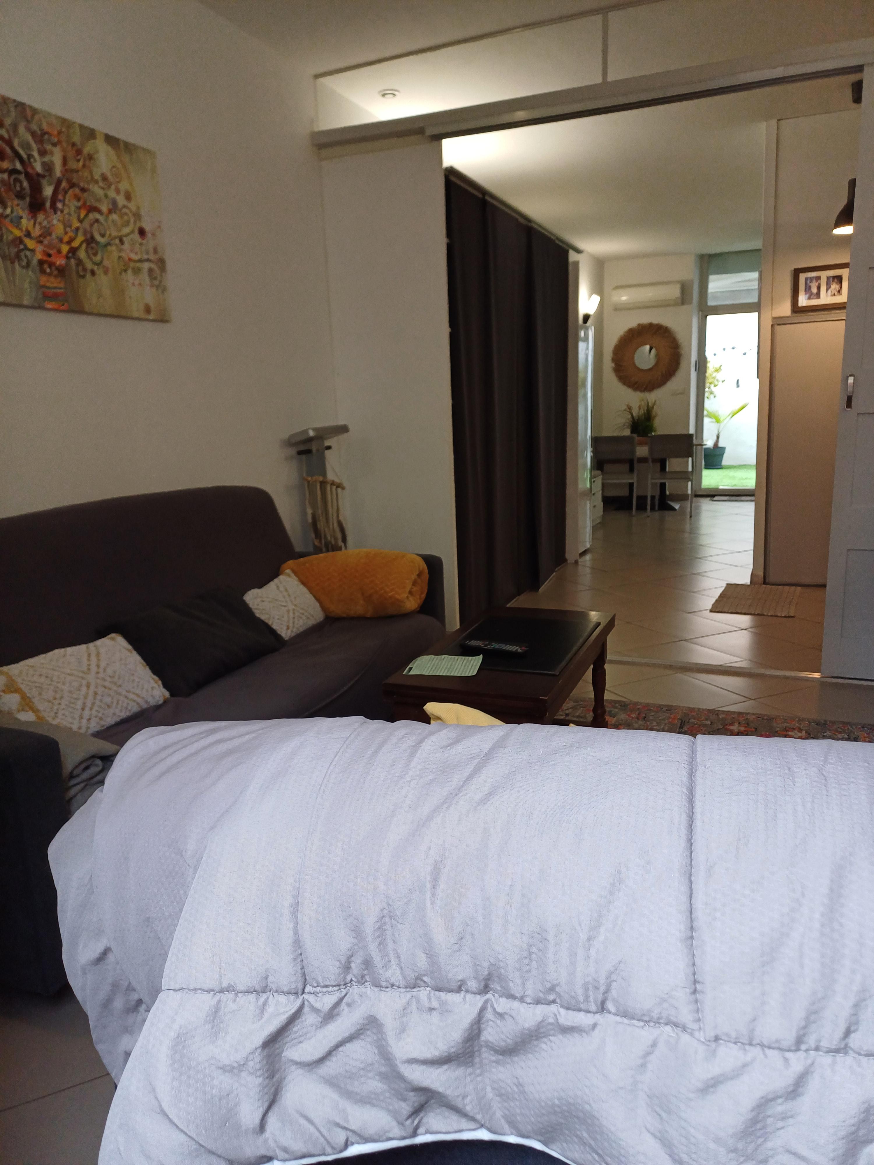 1 living room with kitchenette and lounge area, 102" screen TV (Netflix access) 1 large 18m² living room with two convertible sofas with 140x200 Bultex mattresses 5m² shower room with shower, toilet, sink, washing machine, and separate toilet Equipped kitchen area: 2 induction hobs, 31L multi-function countertop oven, dishwasher, kettle, toaster, filter and Nespresso coffee maker, large fridge-freezer Dry inertia heating and 1 air cooler. Internet access, On-street parking and beach and market parking nearby. All shops, restaurants, and amenities are 100m away, and beaches are 450m away. Bed linens and towels are available upon request and at an additional cost. Table linens are included. Pets are not allowed.