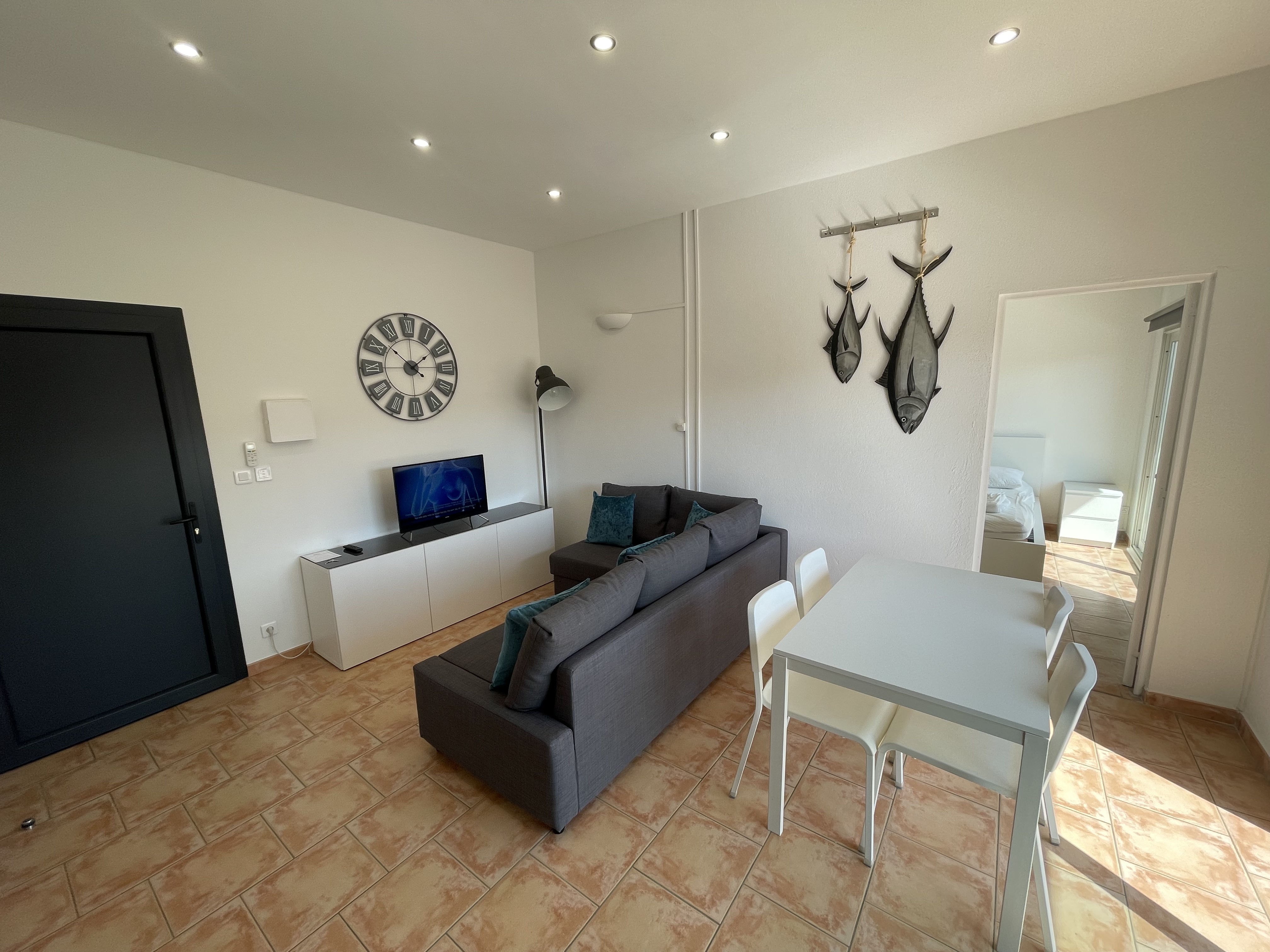 The apartment comprises a main living room/equipped kitchen with sofa bed and a bedroom with a double bed and a bunk bed, bathroom and toilet.