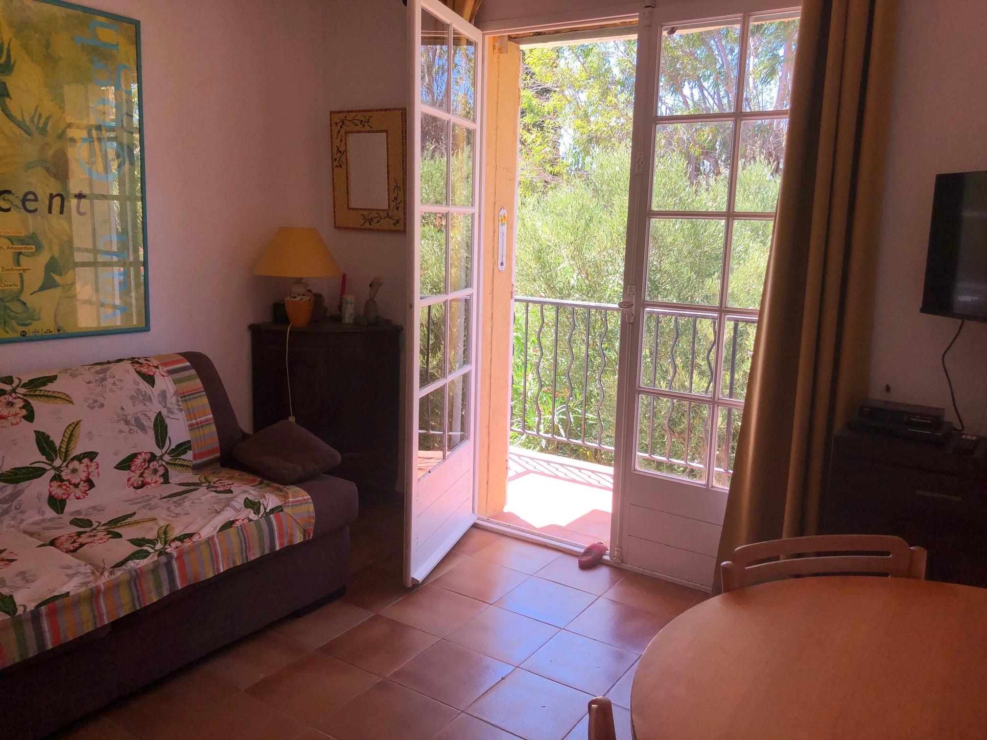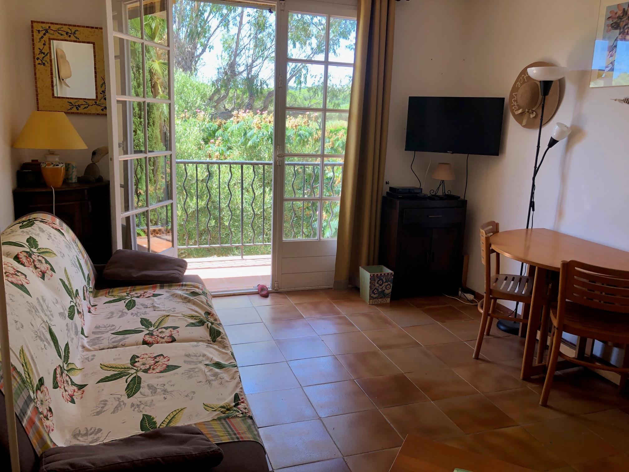 Weekly rental only of a two-room apartment with terrace and balcony at Les Horizons, a pleasant, flower-filled residence just outside the village of Porquerolles.