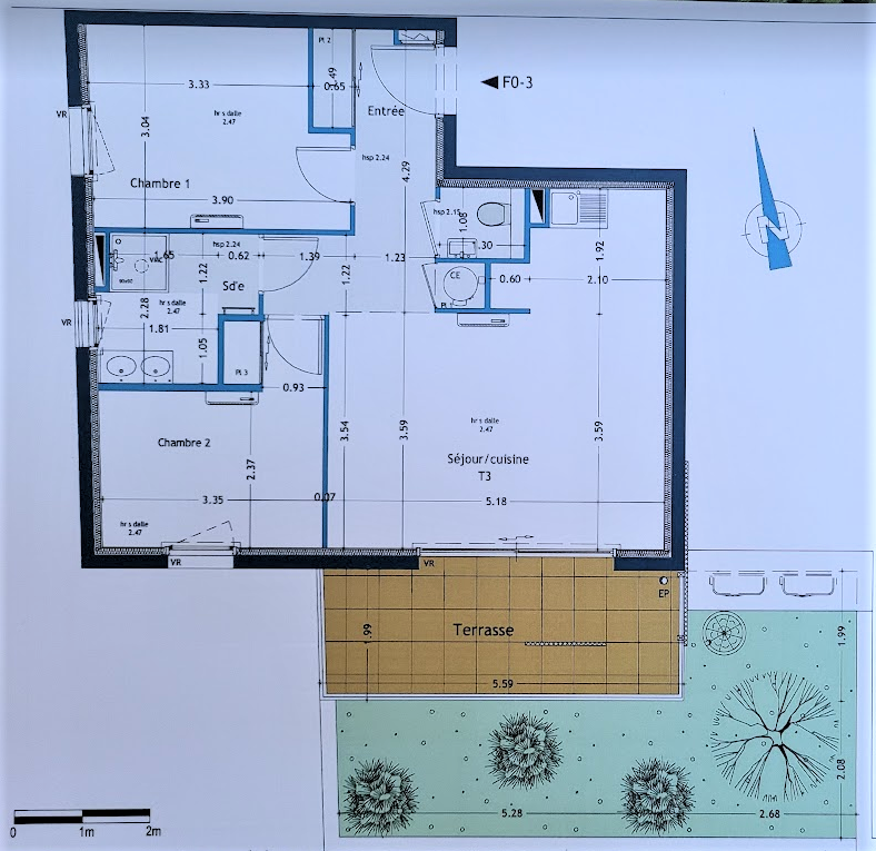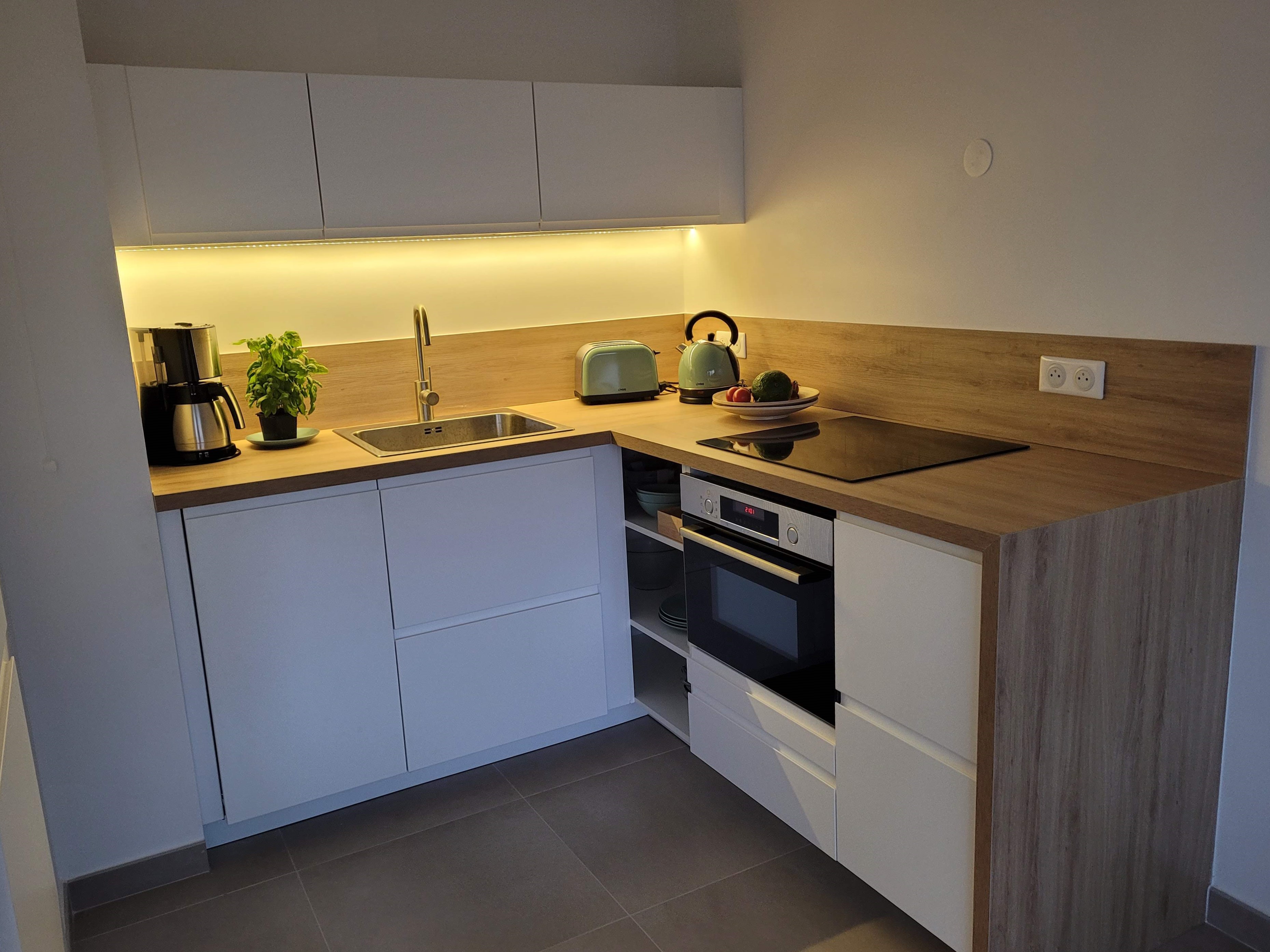 This garden-level T3 comprises a living room with a well-equipped kitchen, 2 bedrooms (one with a 160cm bed and the other with 2 80cm beds that can be moved closer together), a shower room and separate toilet.