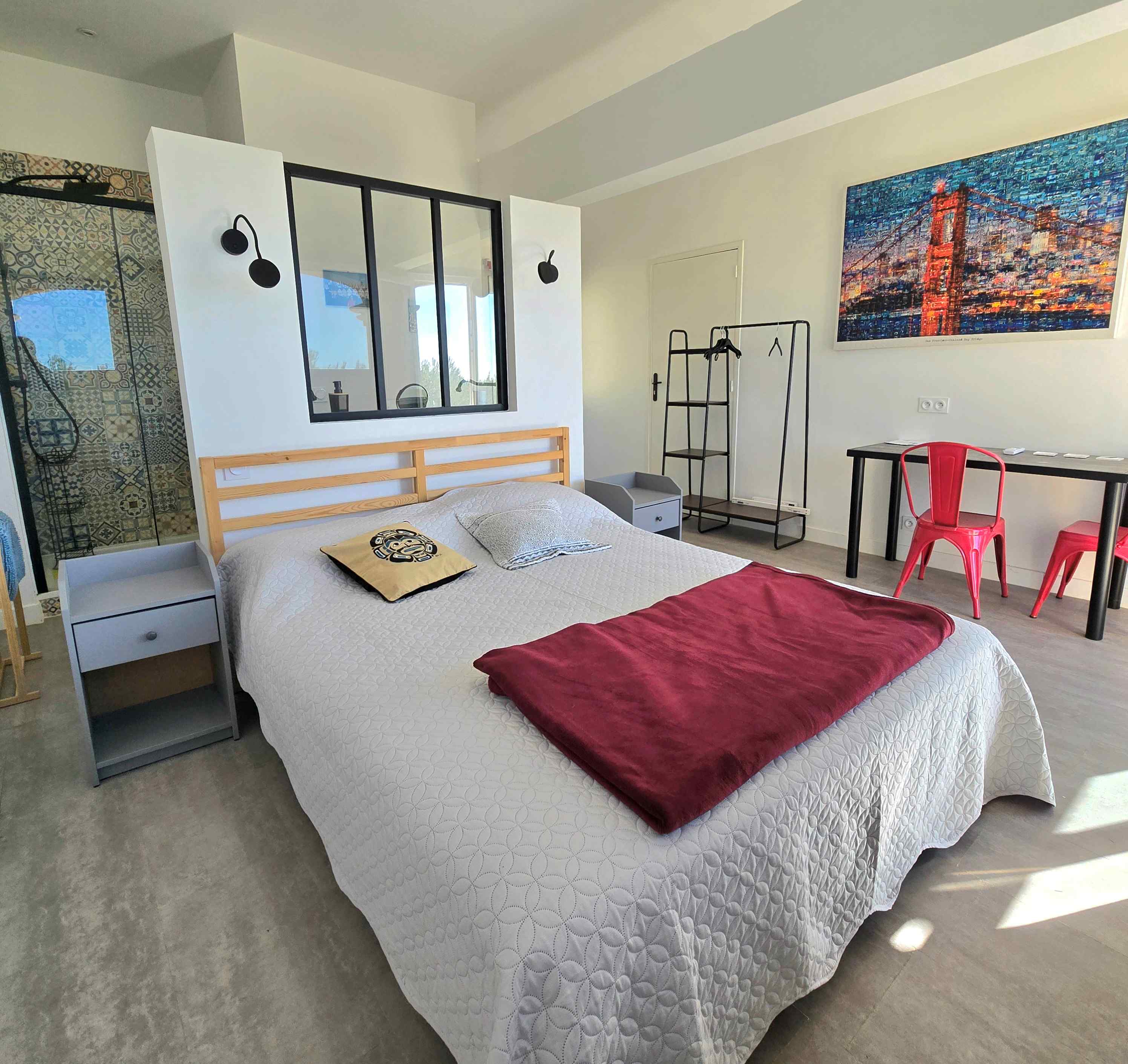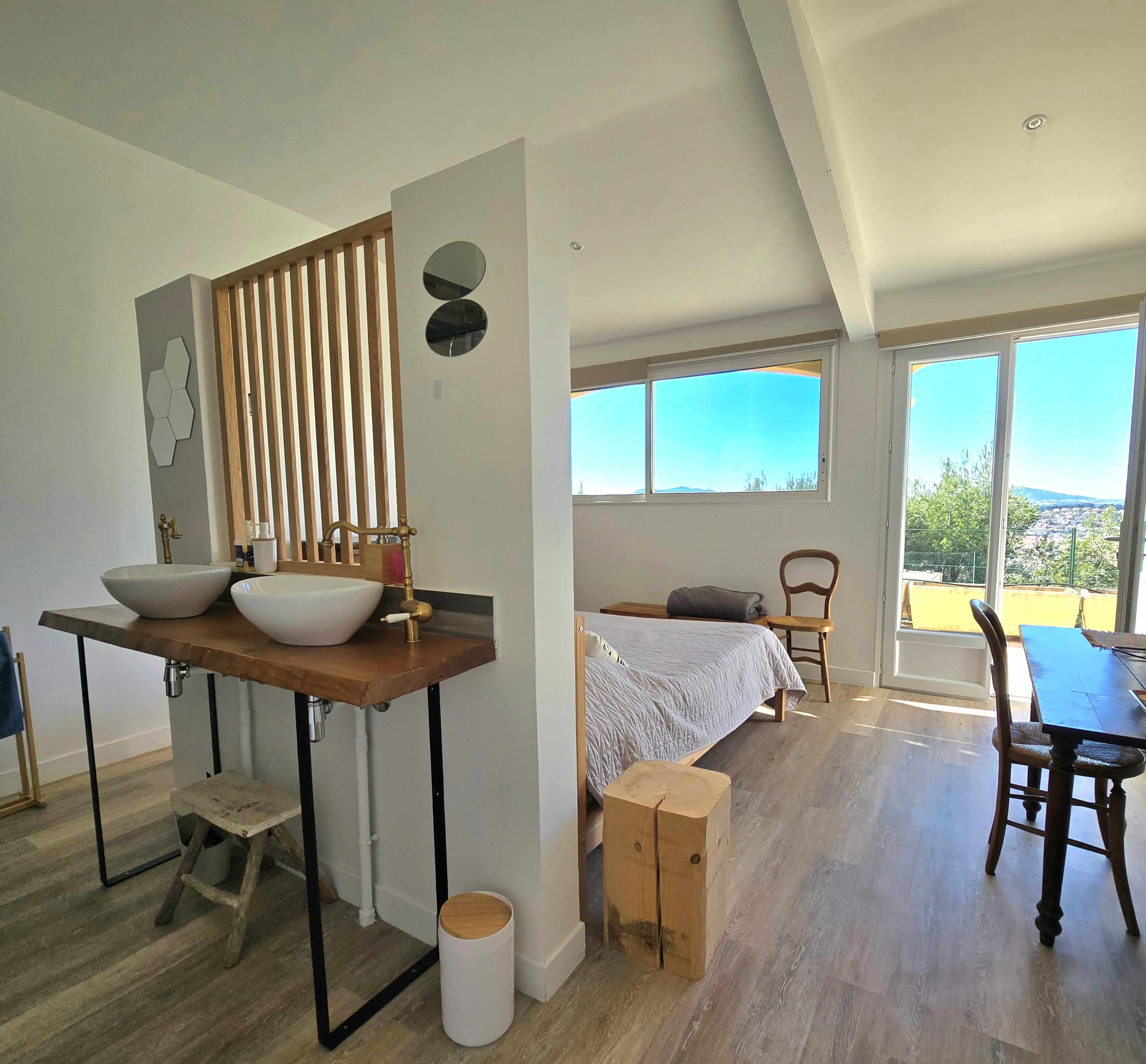 Surrounded by Mediterranean vegetation, LA MAISON BLEUE offers breathtaking views of the Toulon harbor and surrounding hills. The 3 bedrooms, independent of the main house, are an invitation to relax. Spacious and bright, they are equipped with all modern comforts: quality bedding, air conditioning, free Wi-Fi connection and private bathroom with separate toilet. The family room also features a flat-screen TV and kitchenette.