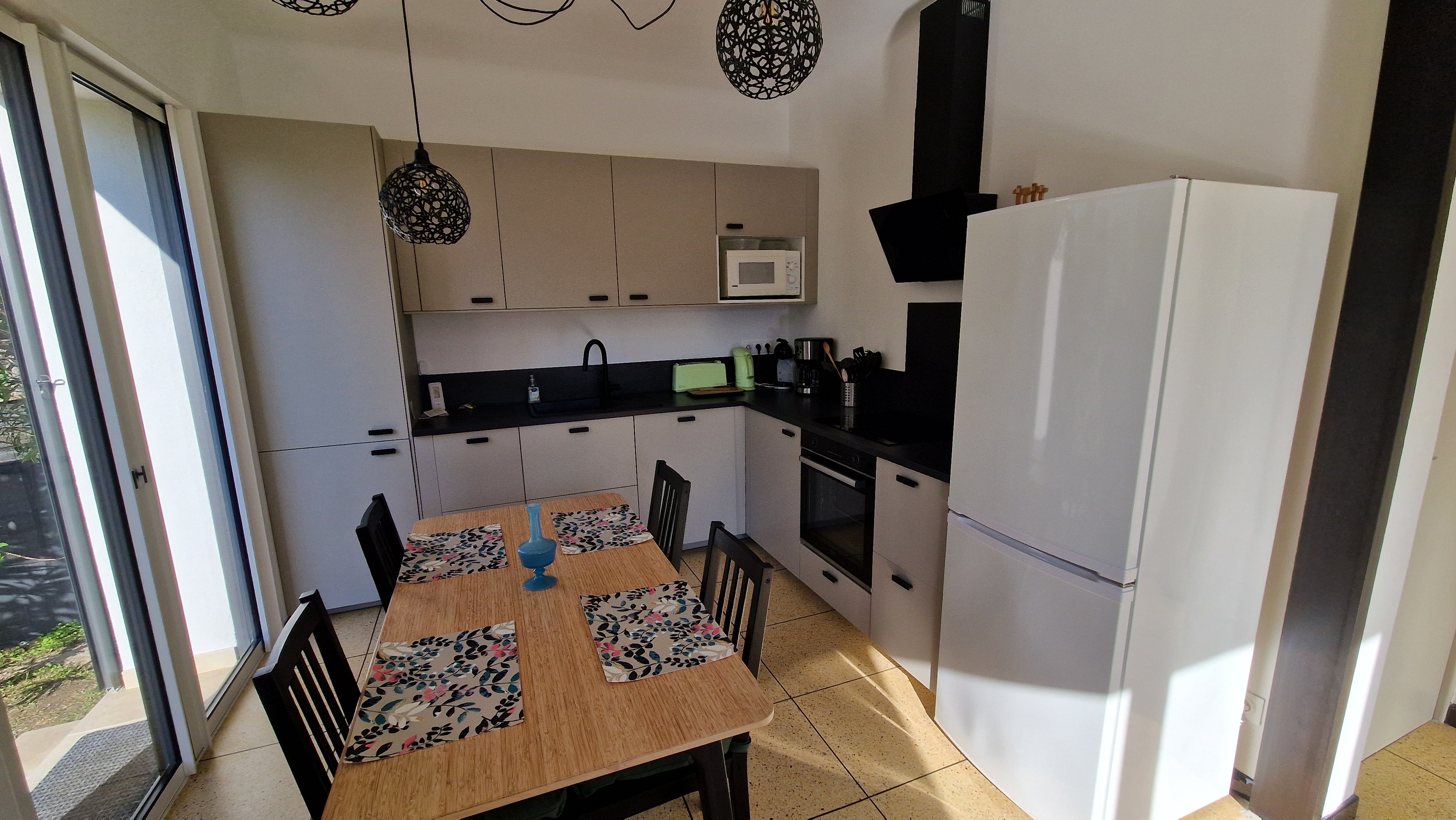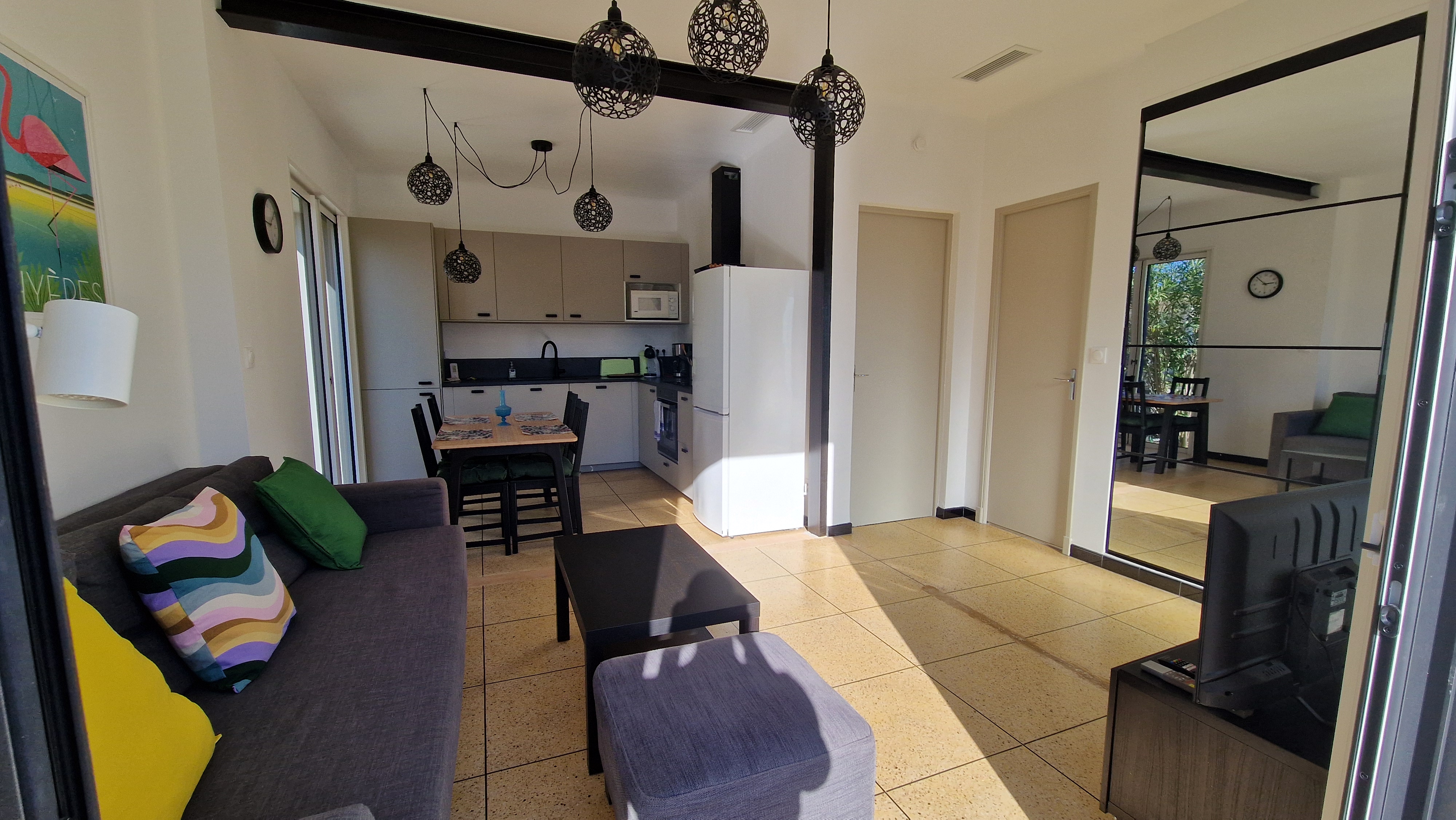 - a main room with a living room featuring a 140x200 sofa bed and a fully-equipped kitchen (including crockery, dishwasher, microwave, etc.) ,