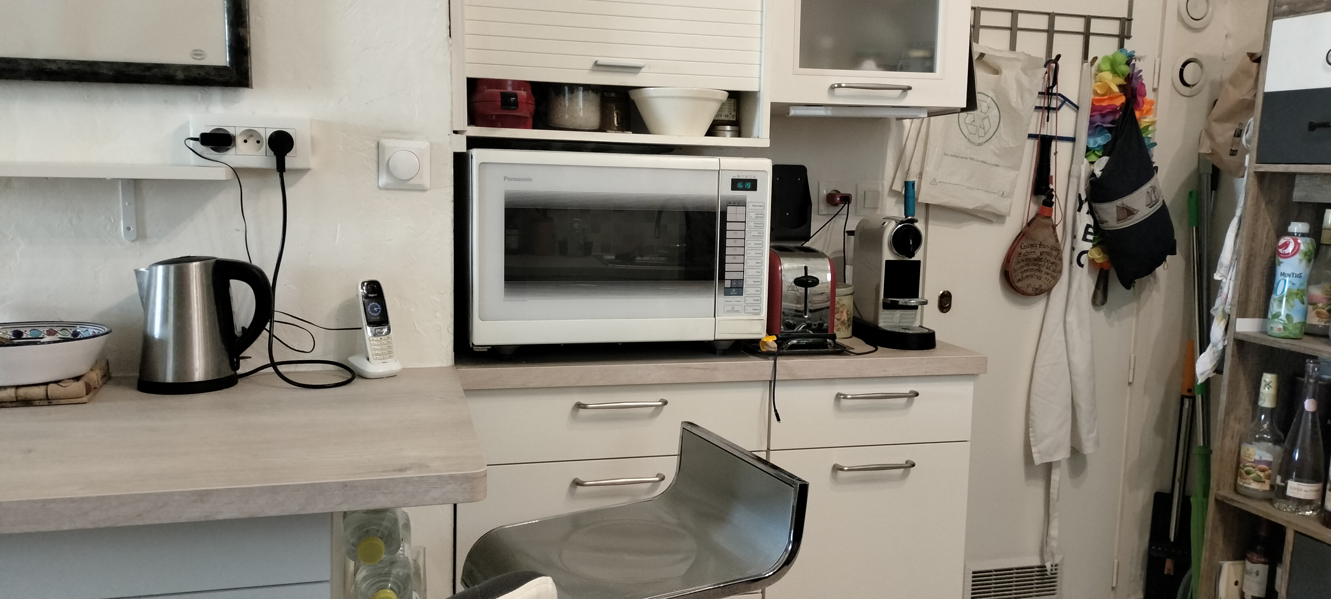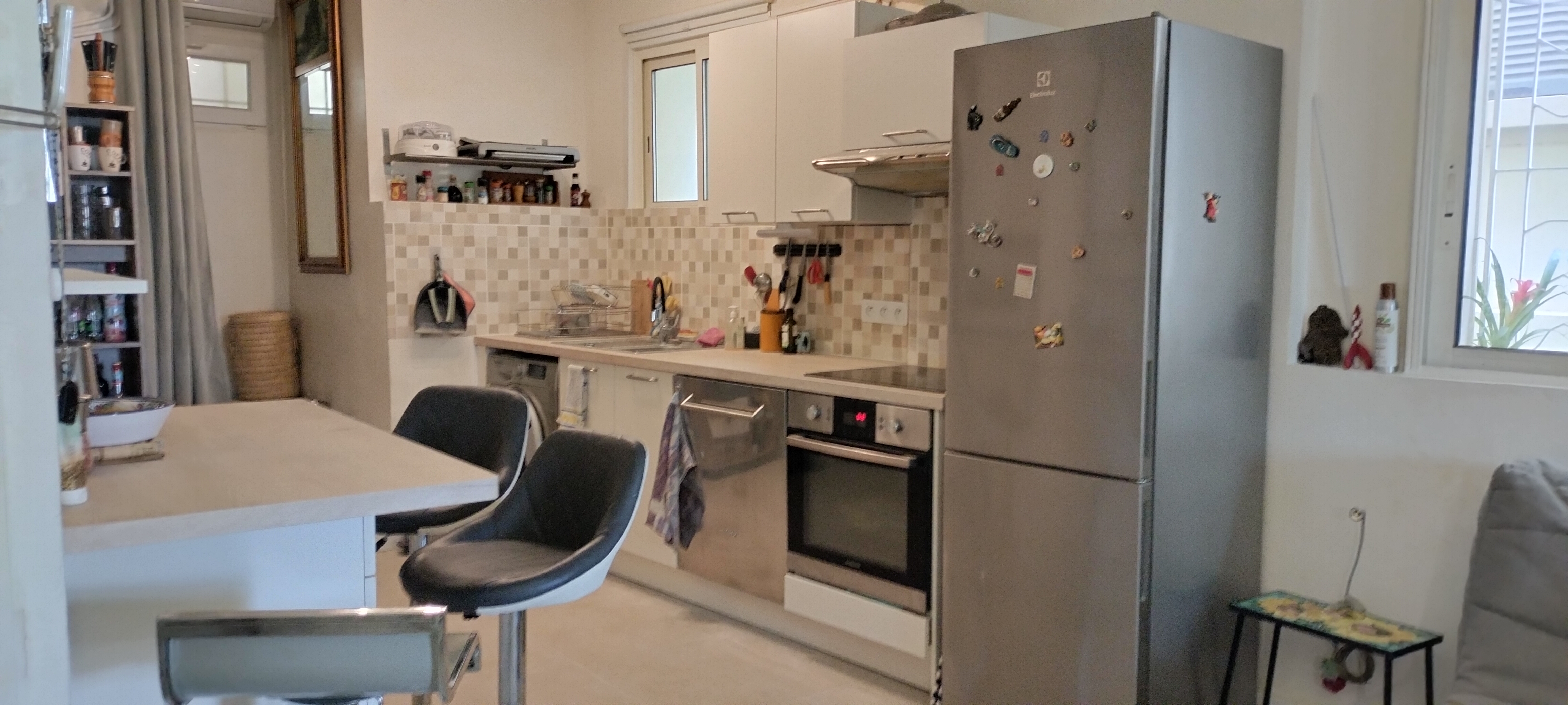The kitchen, open to the living room, is equipped with all the necessary amenities: electric stovetop, oven, microwave, refrigerator-freezer, washing machine, dishwasher, coffee maker, kettle, toaster, and vacuum cleaner.