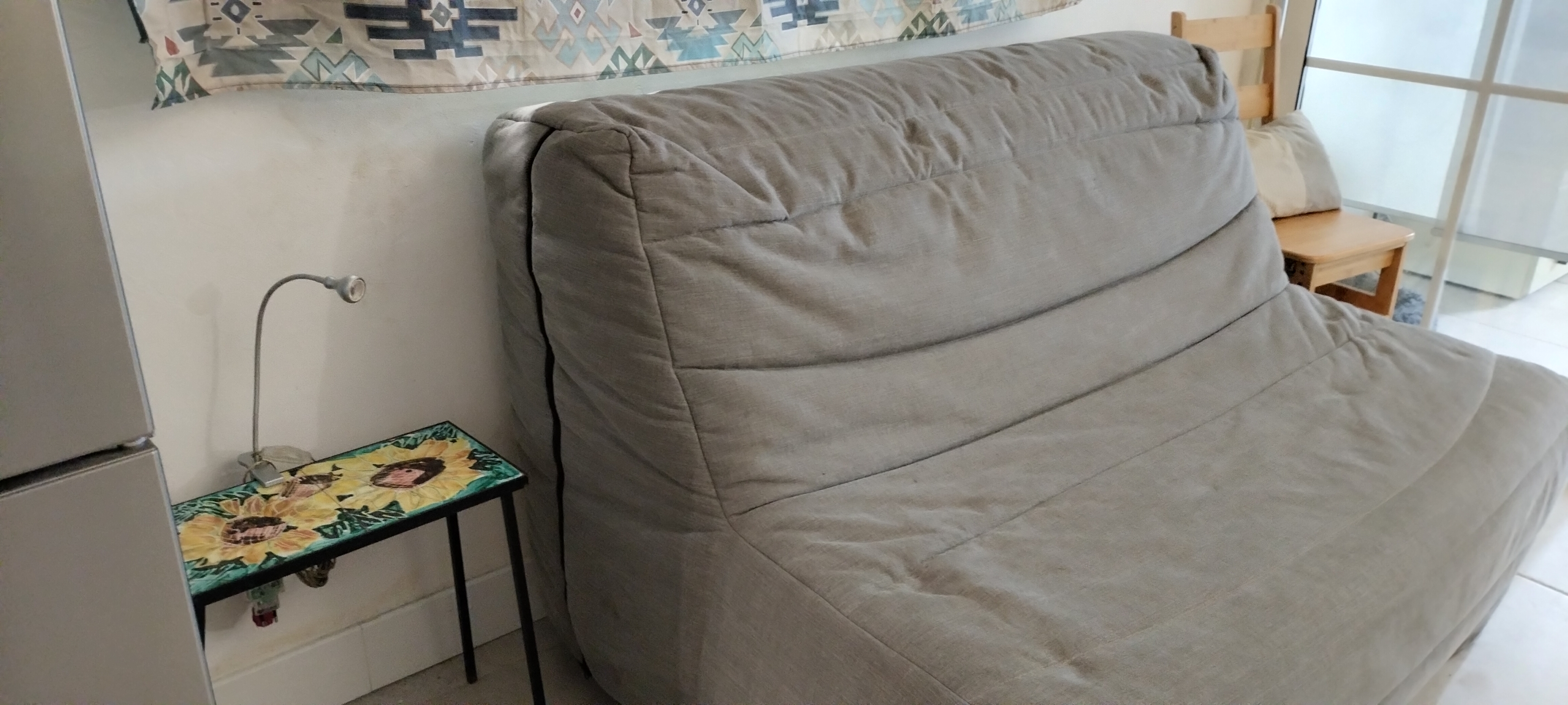 The living room is air-conditioned and features a comfortable sofa bed with a 140cm bed.