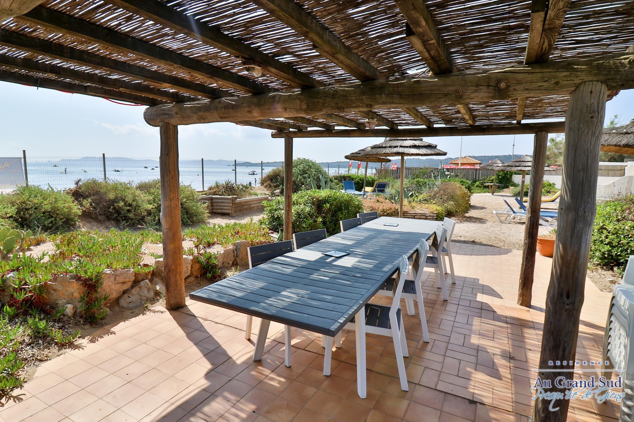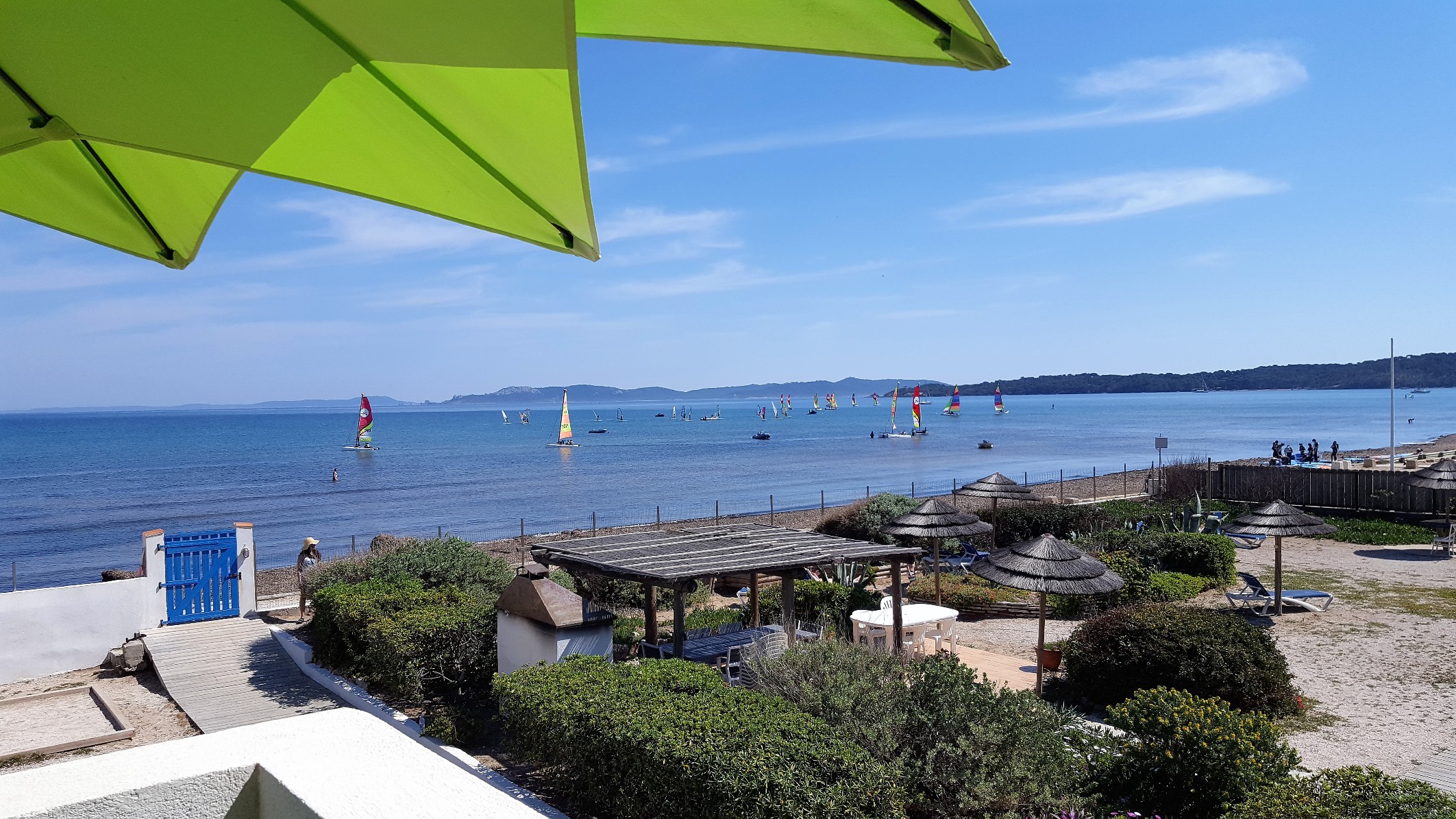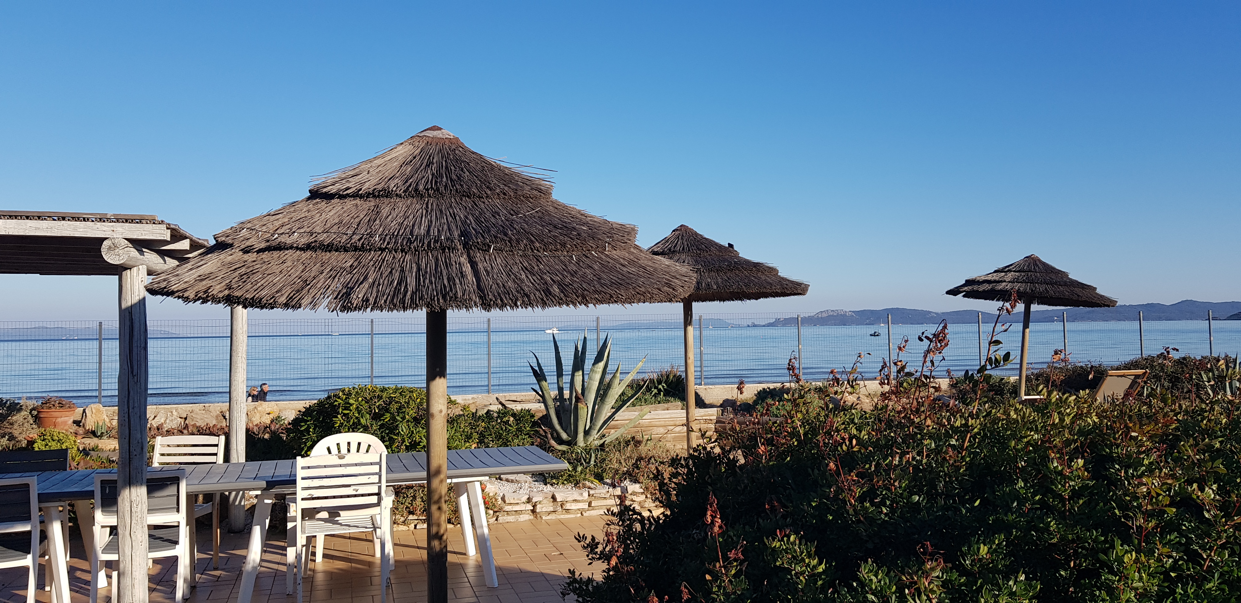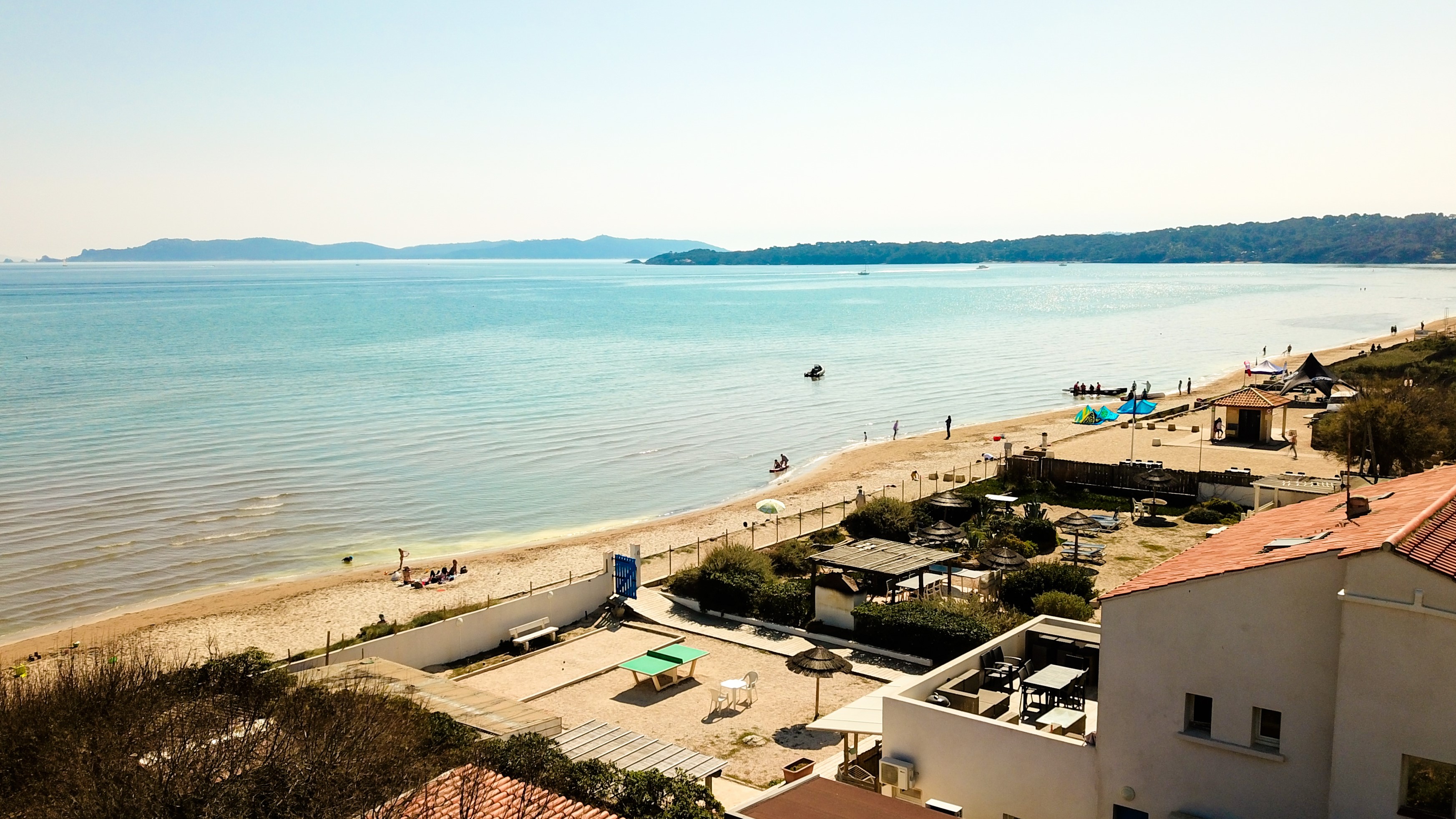 Apartment of 22 m2 on the ground floor, feet in the water, facing the beach with direct access to the sea. Holiday residence facing the Golden Islands, Porquerolles & Port Cros.