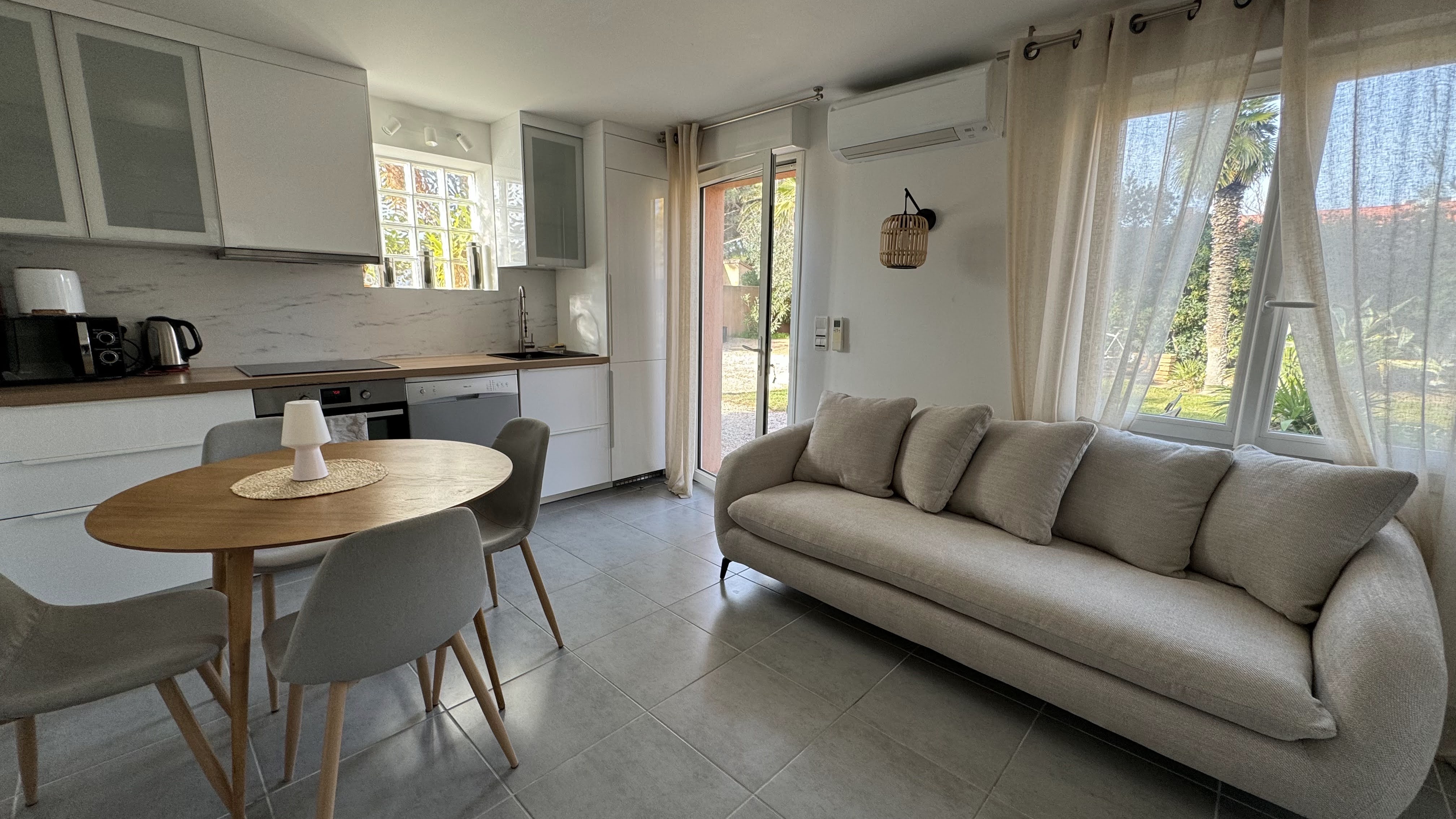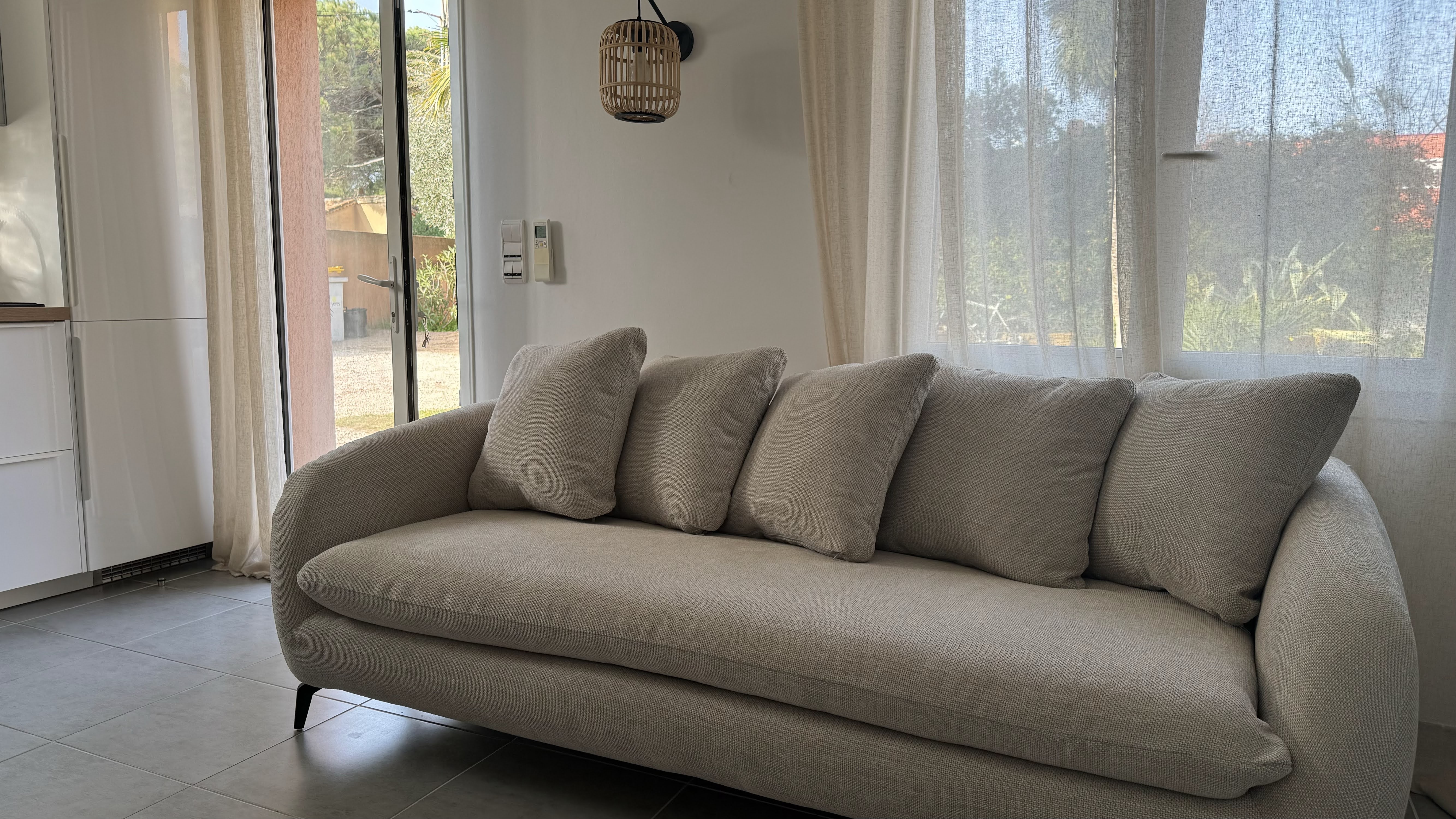A bright living room with a view of the garden ?