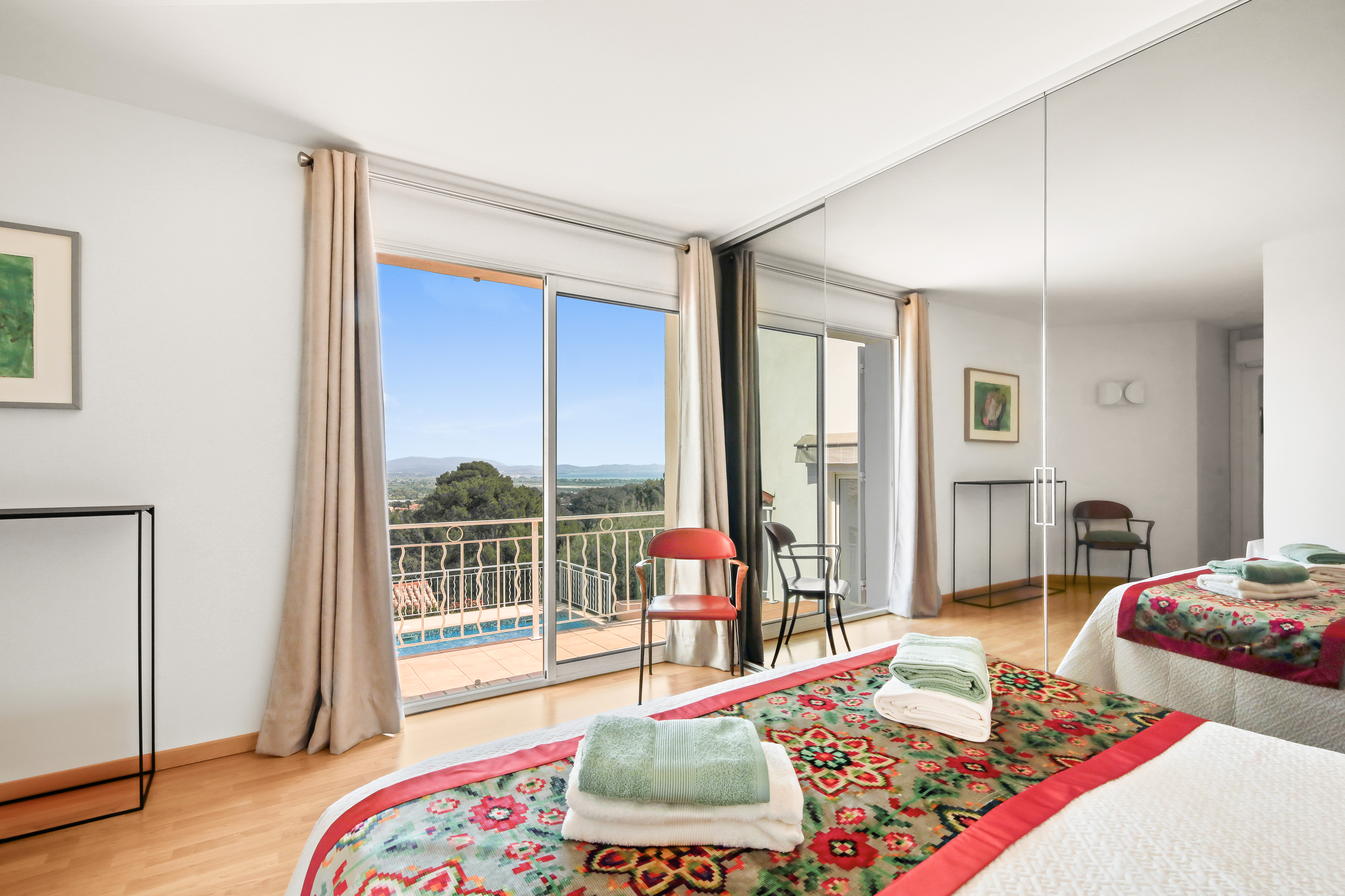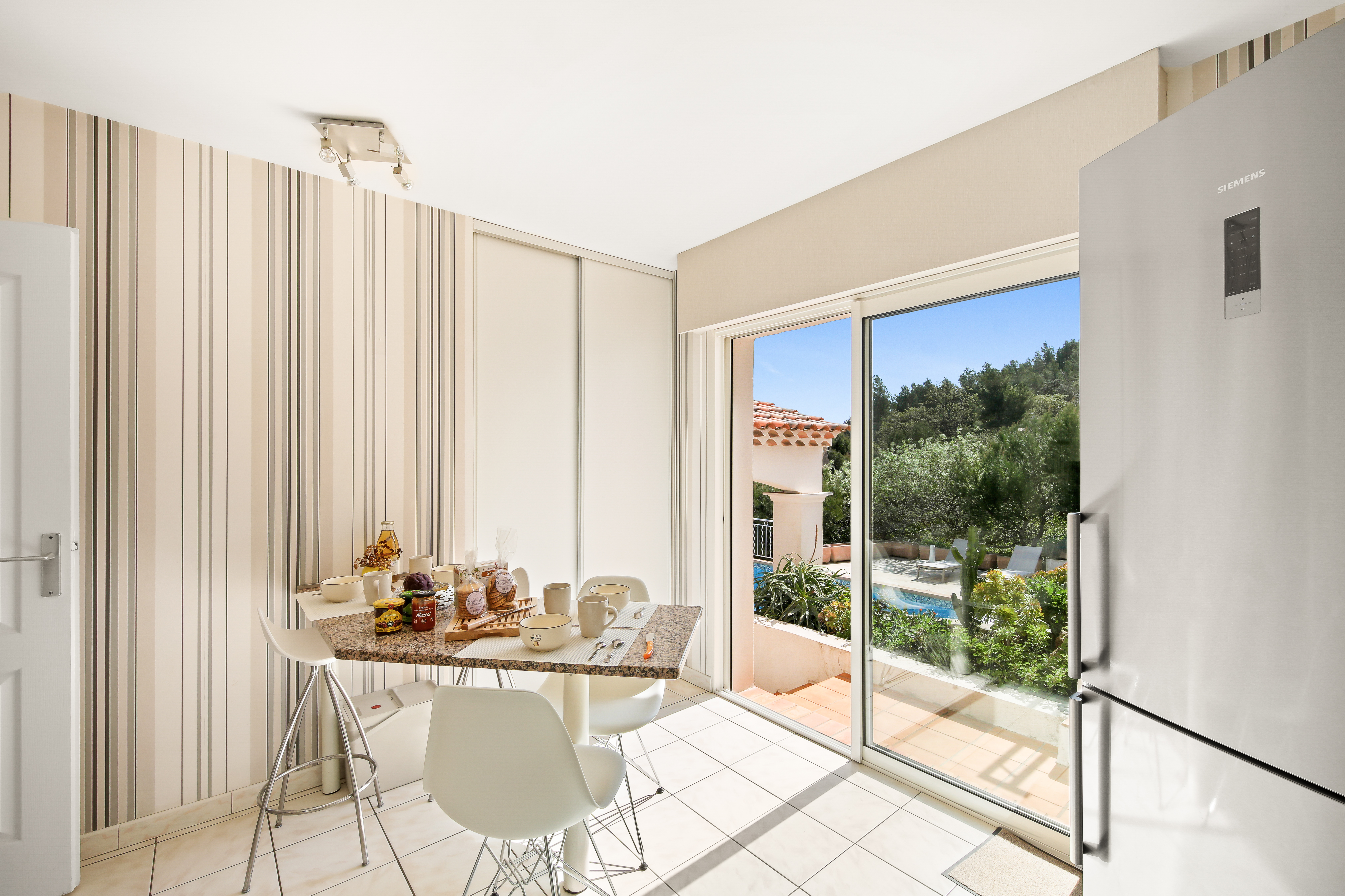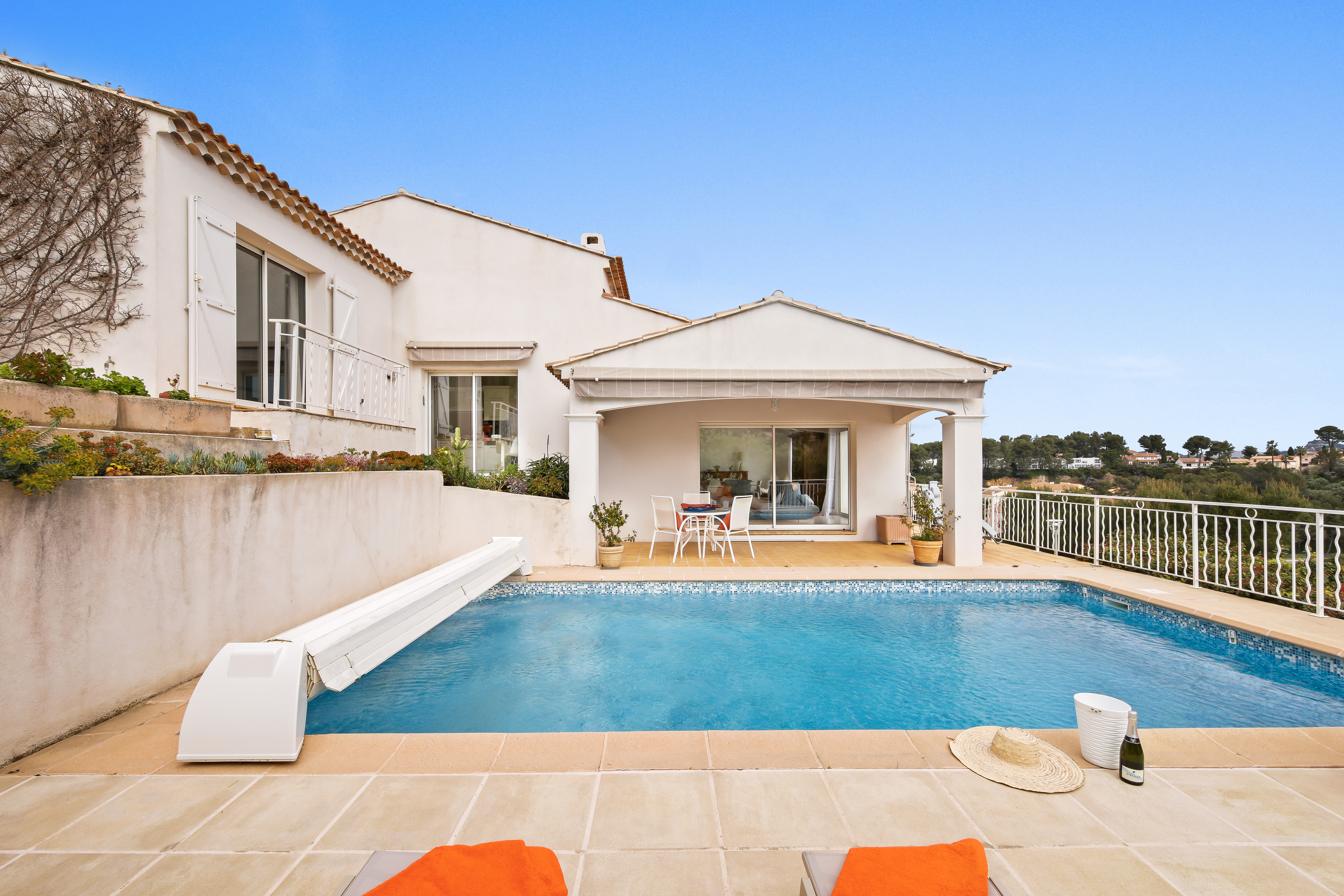 Detached villa 125m2 2 bedrooms + 2 bathrooms with swimming pool, uninterrupted view of the Gulf of Hyères, Cap Bénat and the islands of Port-Clos and Levant on the horizon. Terraced garden, close to beaches (8 minutes by car) and all shops in the station area.