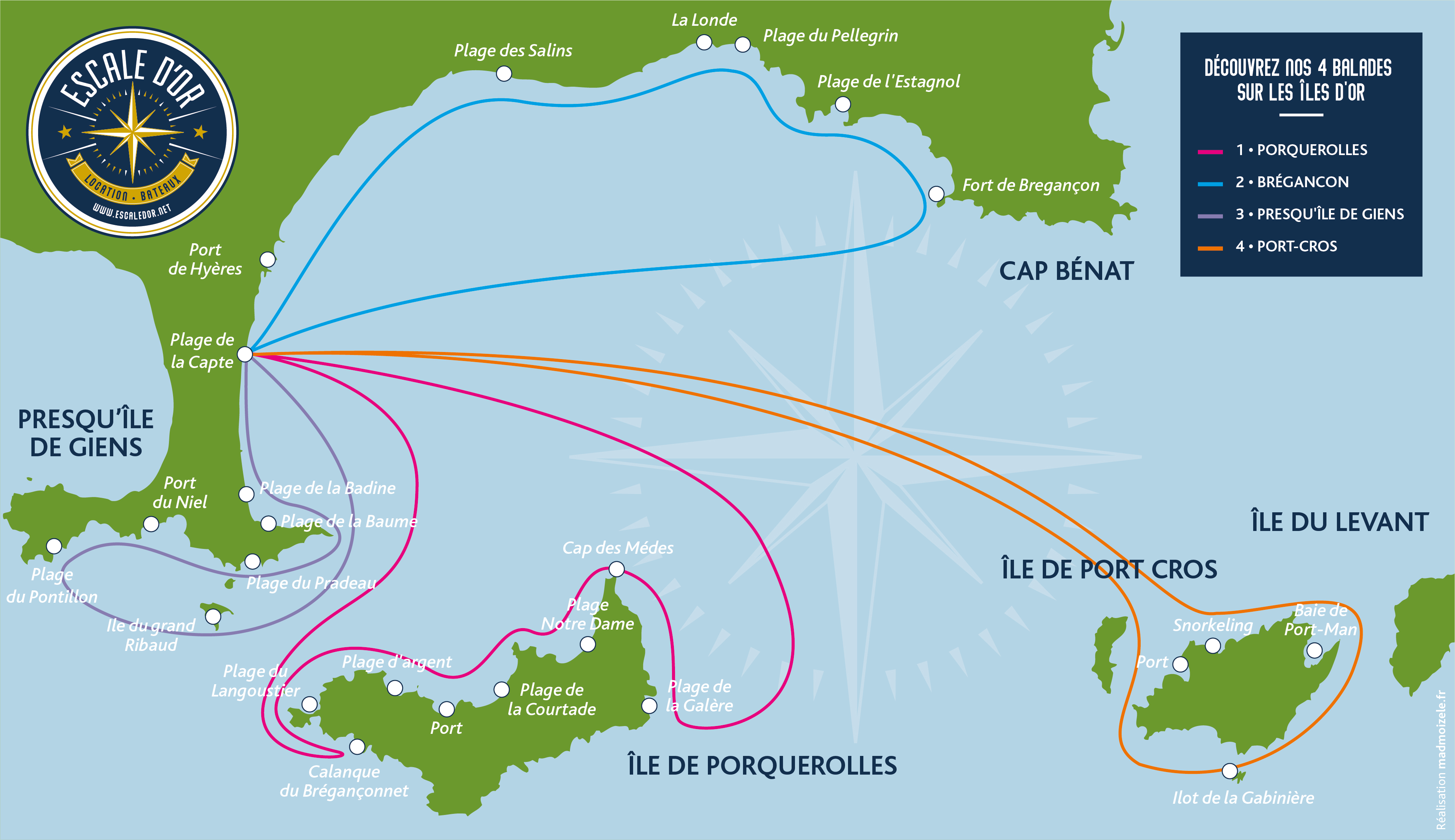 Partendo da Plage de la Capte, ci si dirige verso Porquerolles, la selvaggia Plage de la Galère, Cap des Mèdes (punto di immersione), la magnifica Plage de Notre-Dame, Plage de la Courtade, il porto di Porquerolles e l'accesso al villaggio.