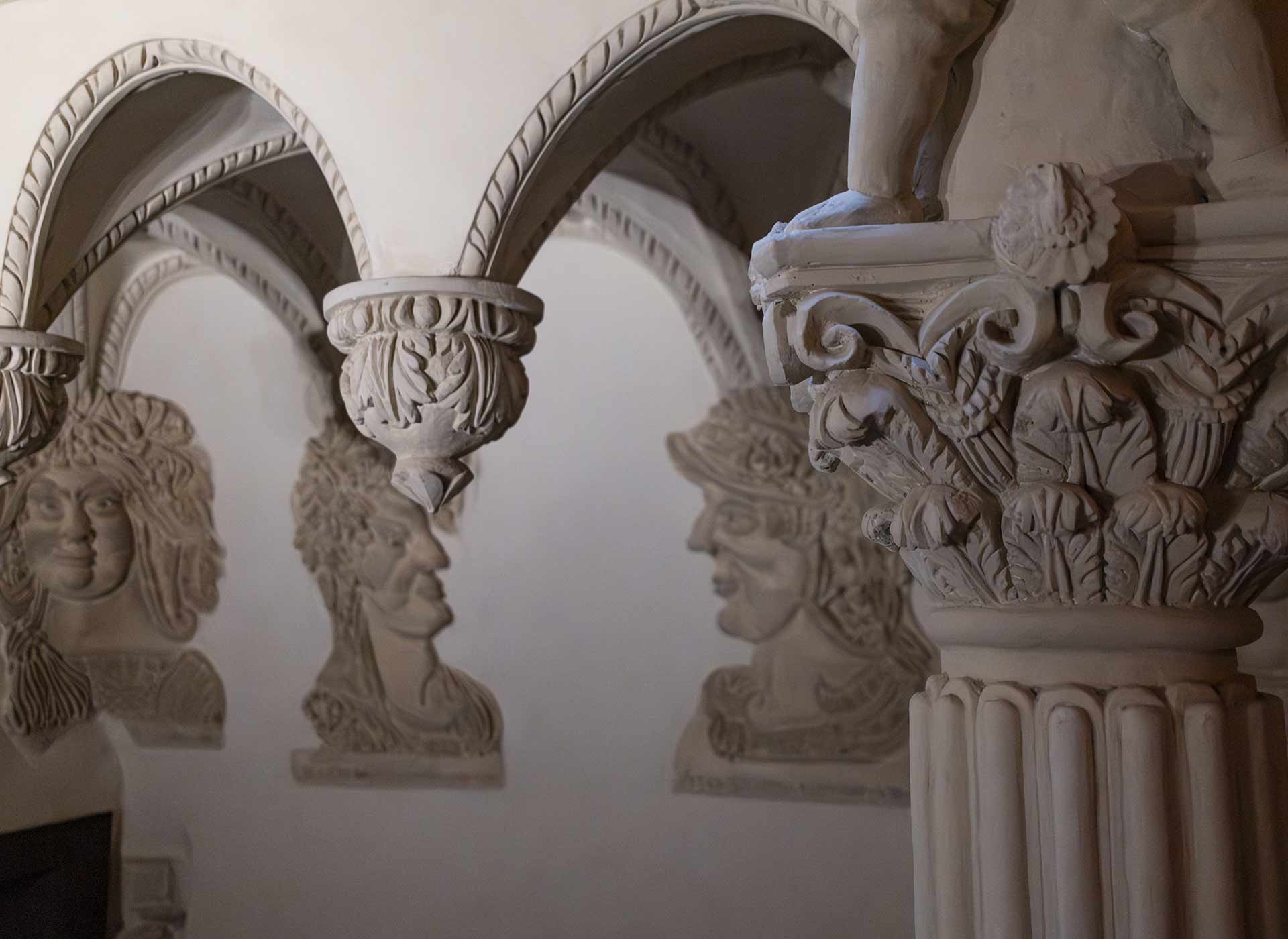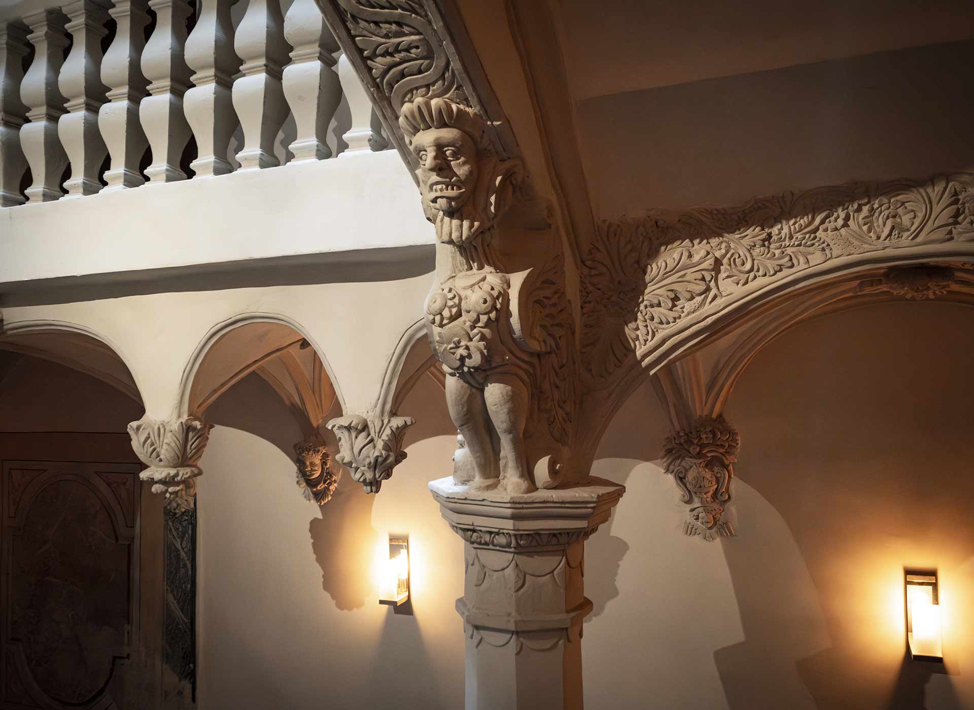 Questa dimora privata presenta rare decorazioni manieristiche in gesso e grandi volte a crociera rinascimentali completamente restaurate, ma il fulcro dell'arredamento è la notevole scala a balaustre ornata da una splendida decorazione in gesso.