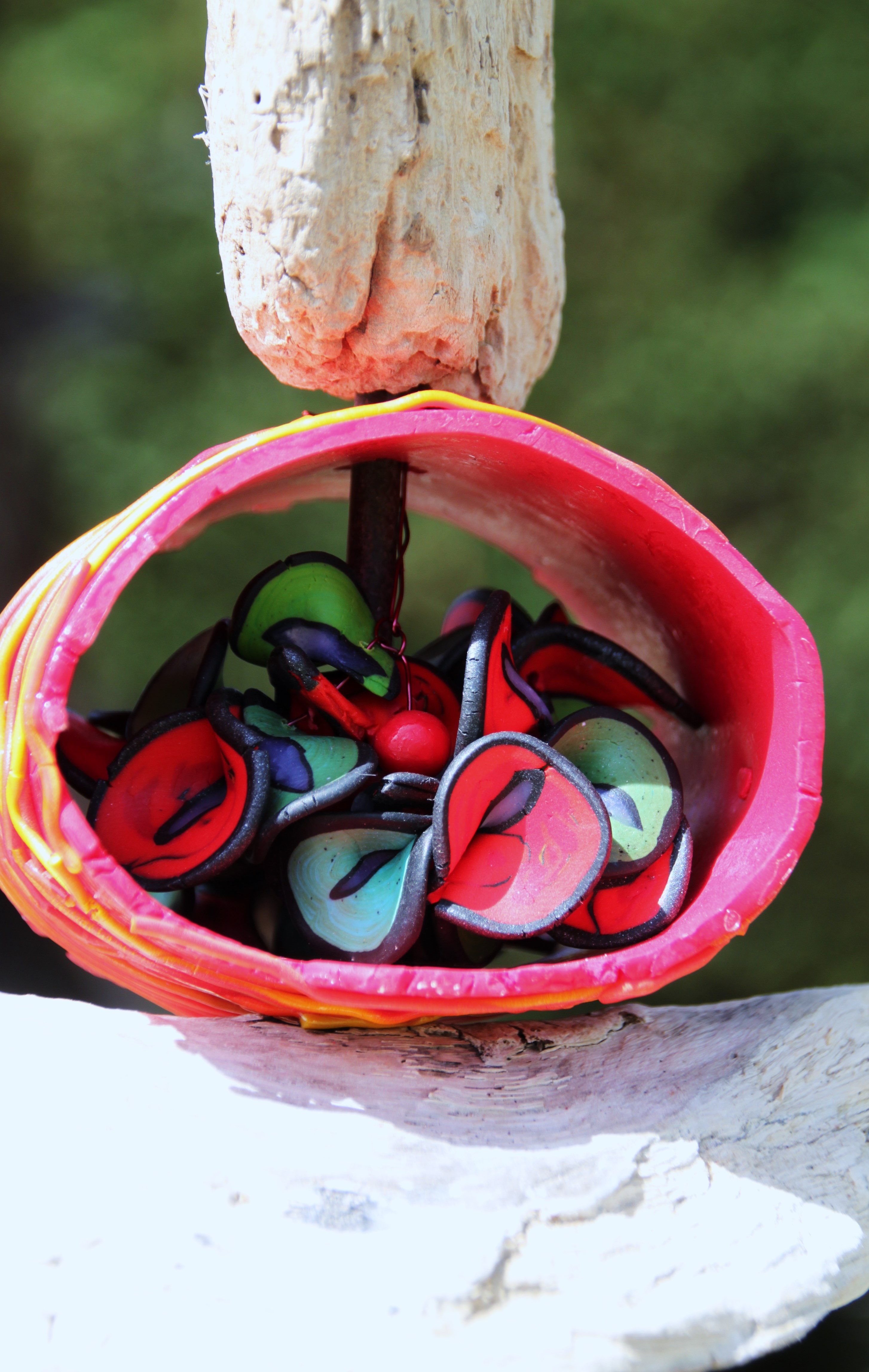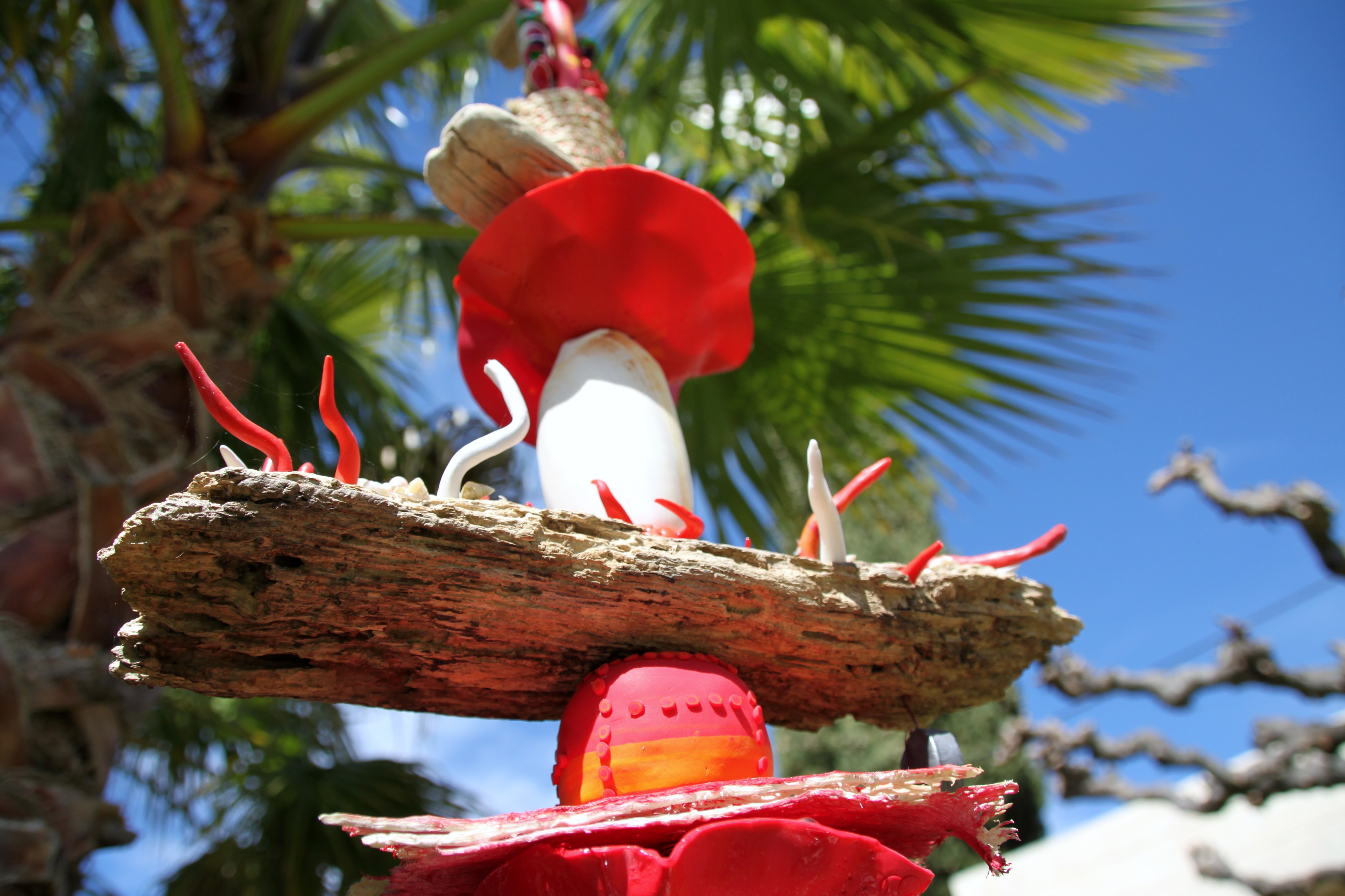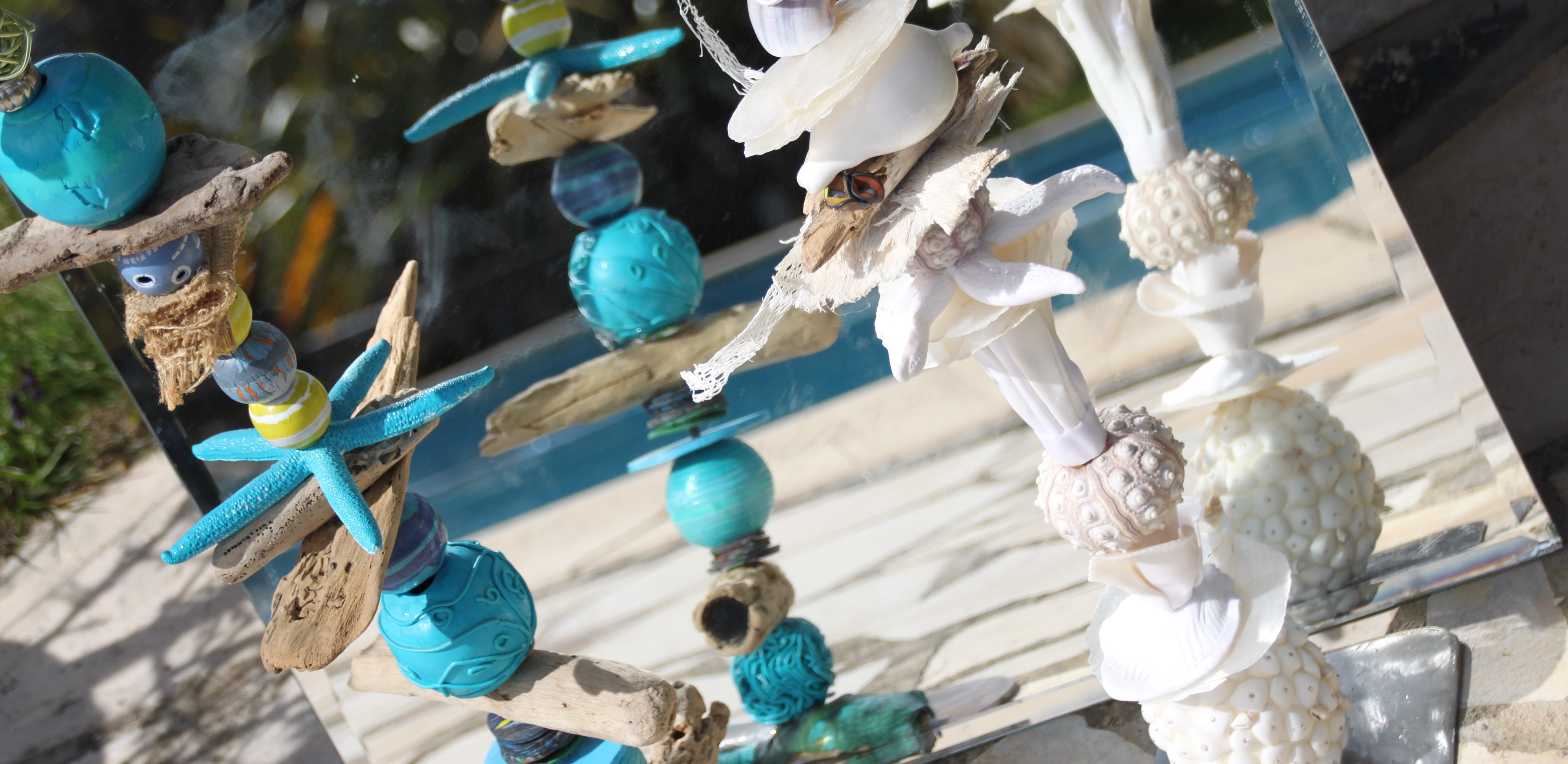 Mme Papillon crea oggetti come totem e mobiles combinando forme di legno di deriva, conchiglie e materiali vari che trova durante le sue passeggiate. Maschere di terracotta