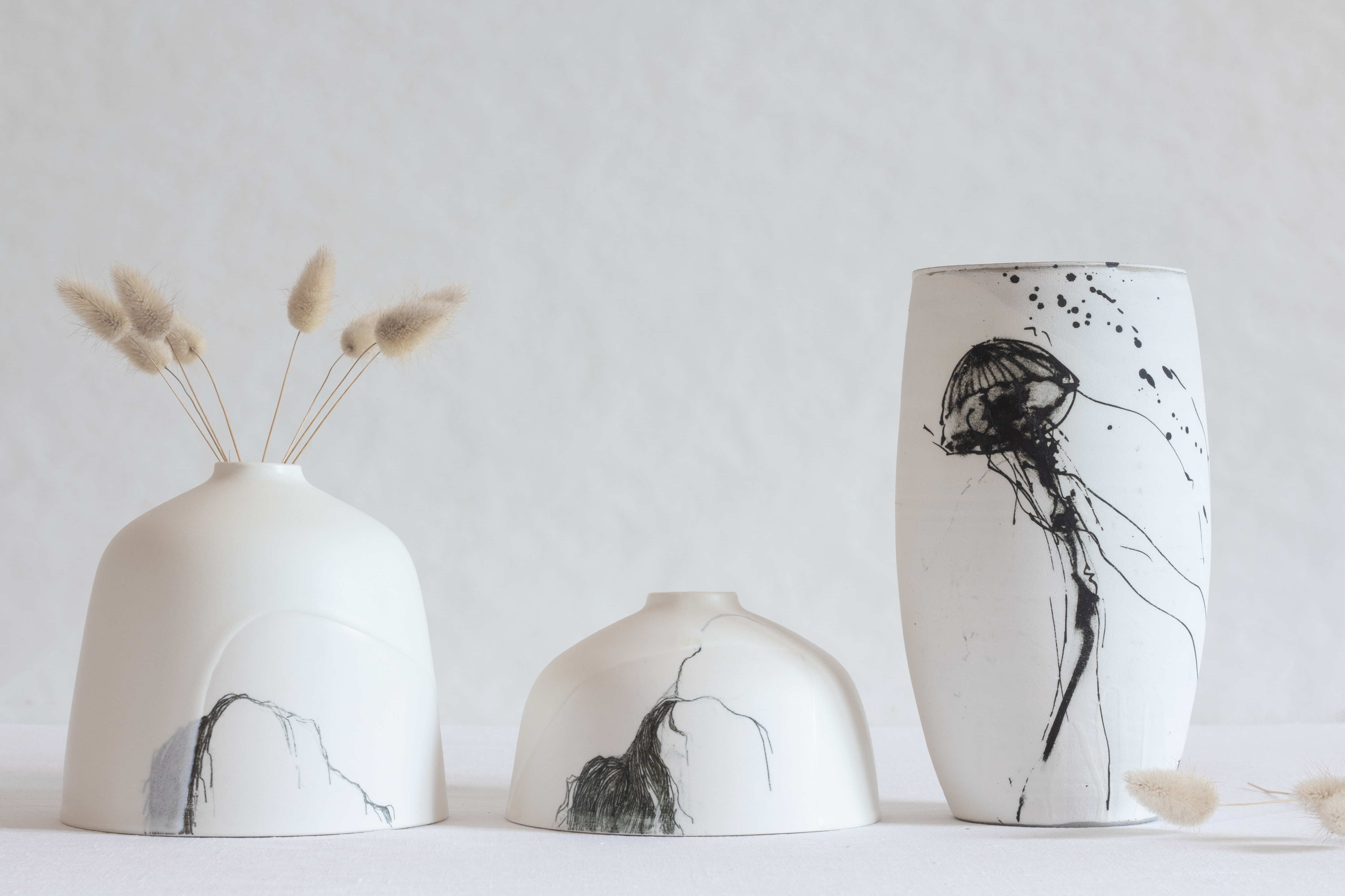 Diviso in due aree separate, ognuno di noi lavora a modo suo. Le nostre tecniche e le nostre argille preferite sono diverse. Pierre lavora principalmente il gres al tornio, mentre Stéphanie crea pezzi in porcellana con un processo di stampaggio e fusione. In questo modo, possiamo esprimere liberamente la nostra sensibilità artistica attraverso le nostre rispettive creazioni, che si mettono in mostra e si completano a vicenda.