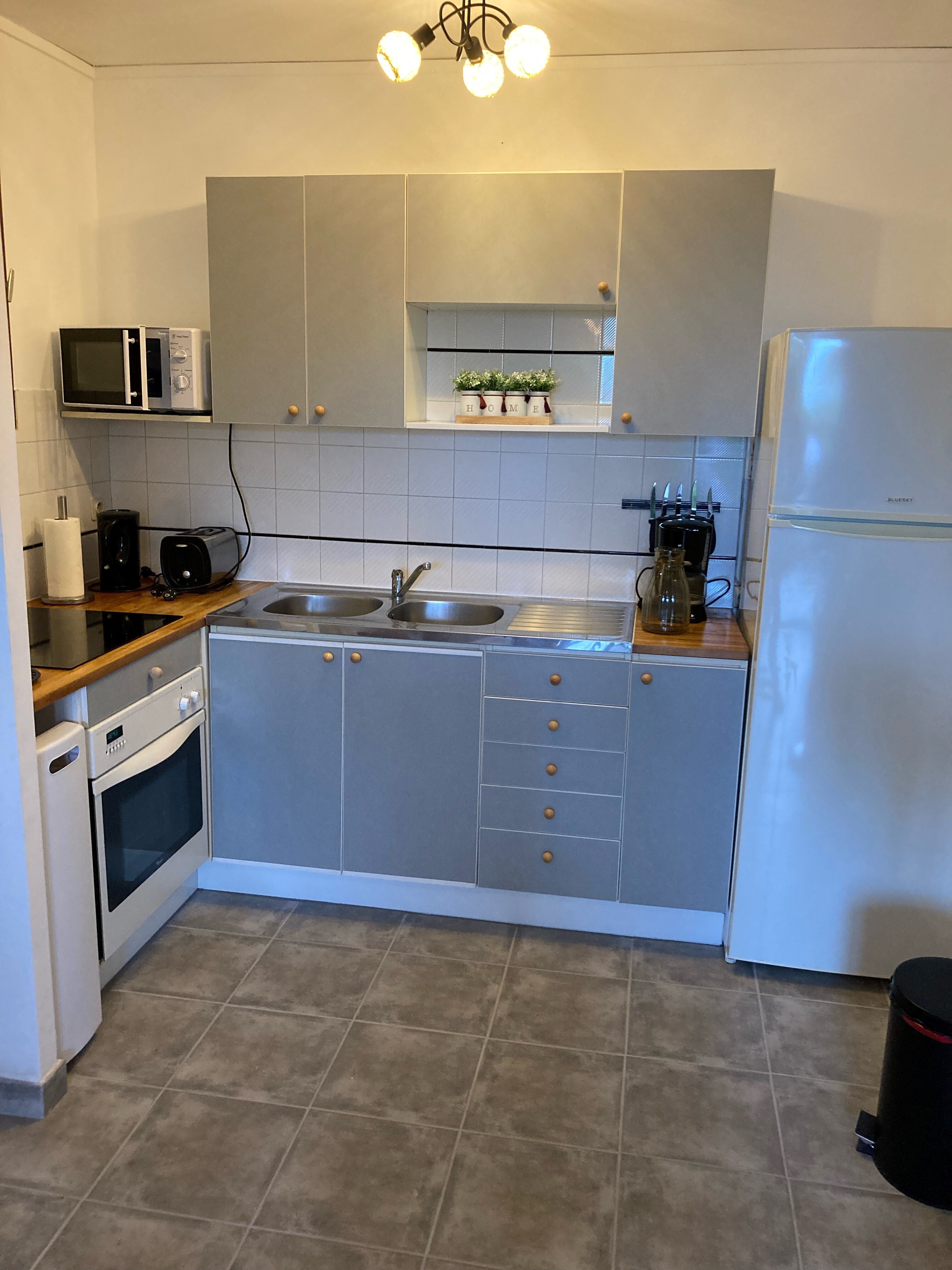 La cucina a vista è dotata di forno, microonde, grande frigorifero-congelatore, piano cottura in vetroceramica, bollitore elettrico, tostapane e macchina per il caffè.