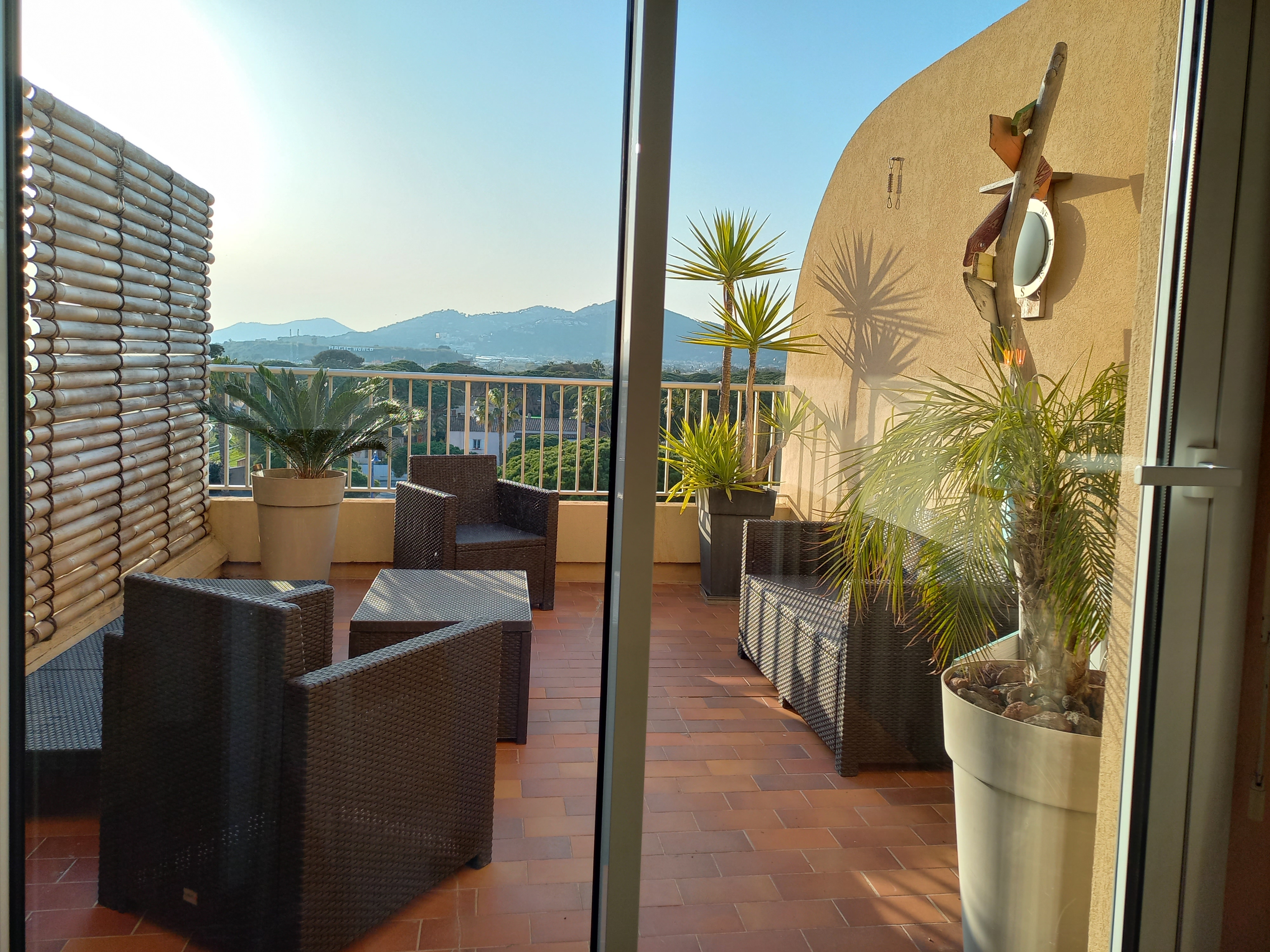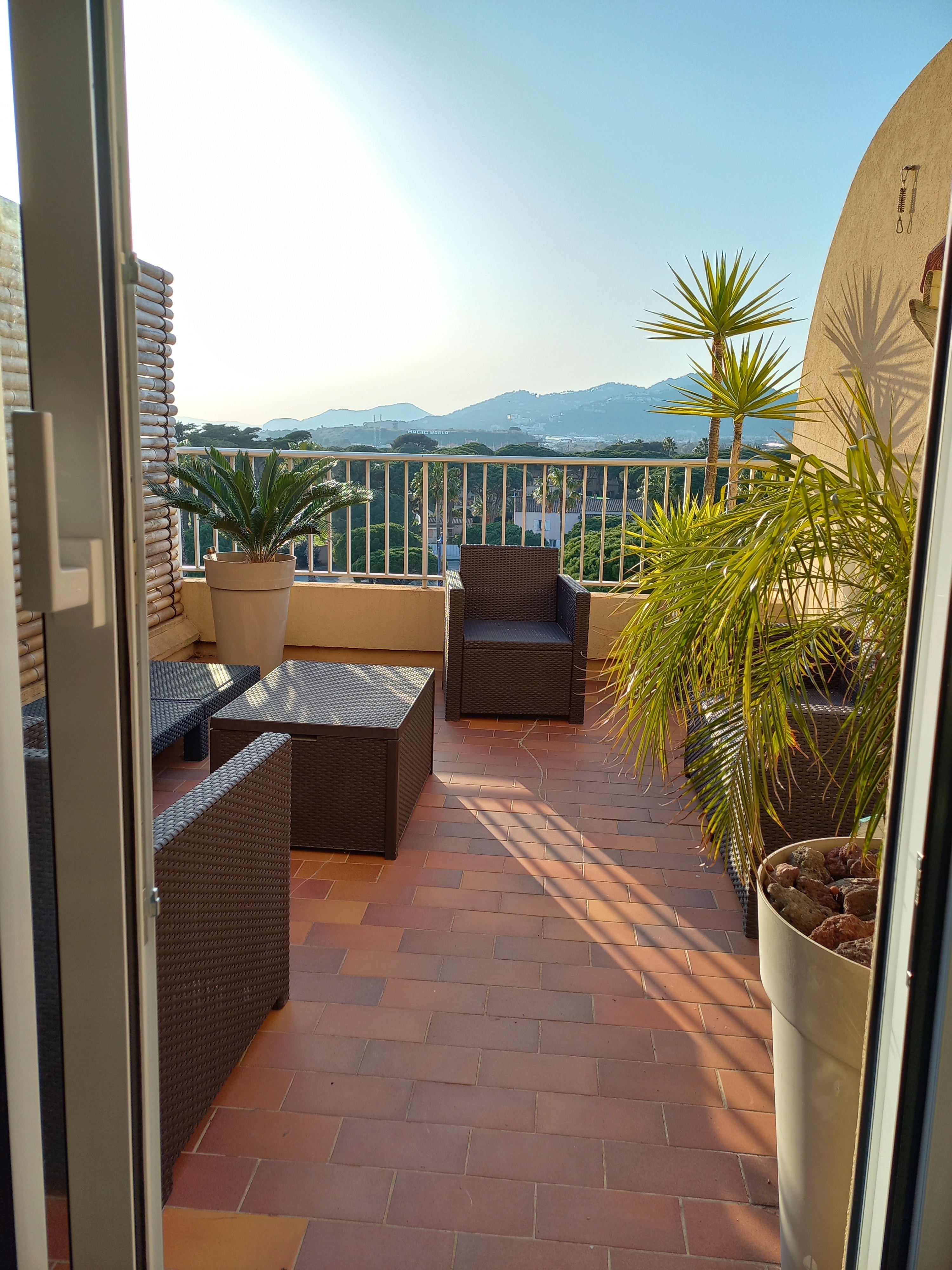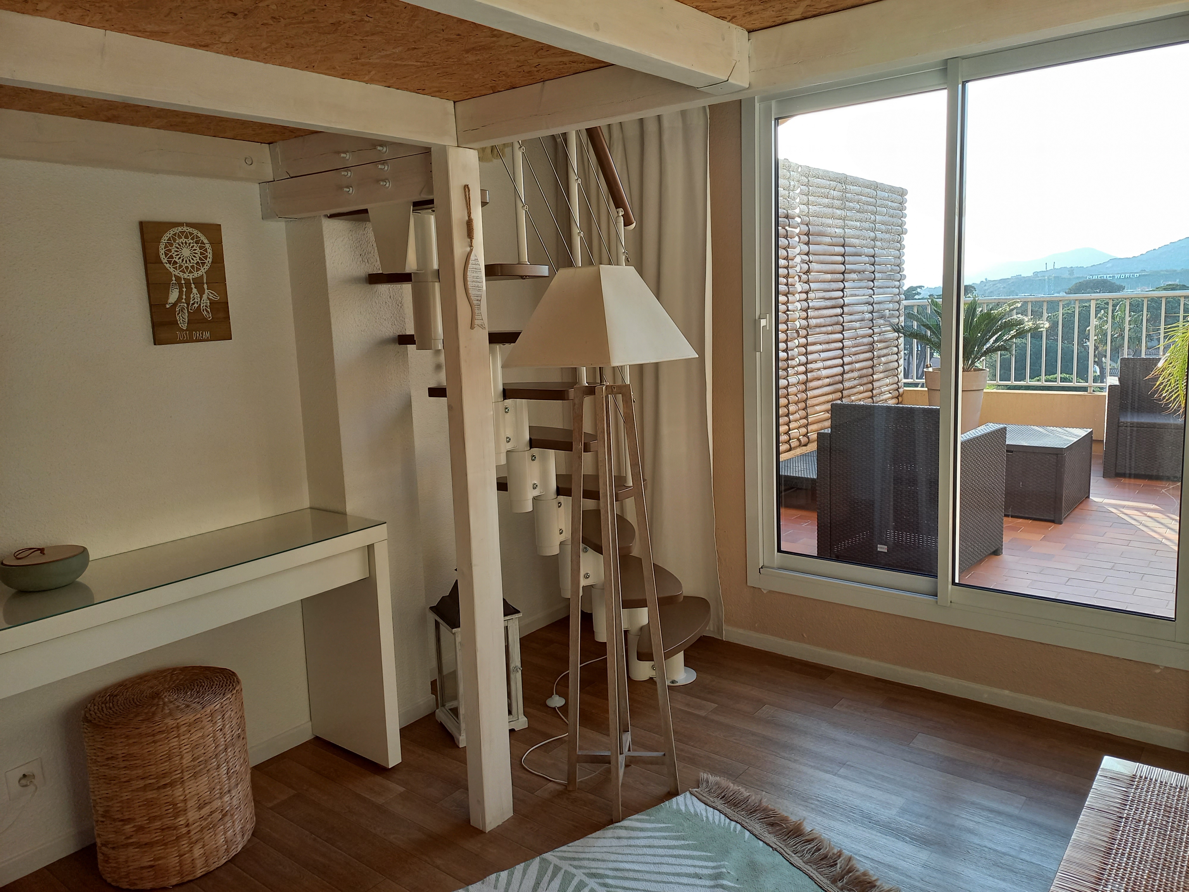 Appartamento duplex di 36 m², completamente ristrutturato, all'ultimo piano con ascensore. Splendida vista dalle 2 terrazze (9 e 14 m²) sulle colline di Hyères e sull'ippodromo, con una piccola vista sul mare della spiaggia di Almanarre, che offre magnifici tramonti.