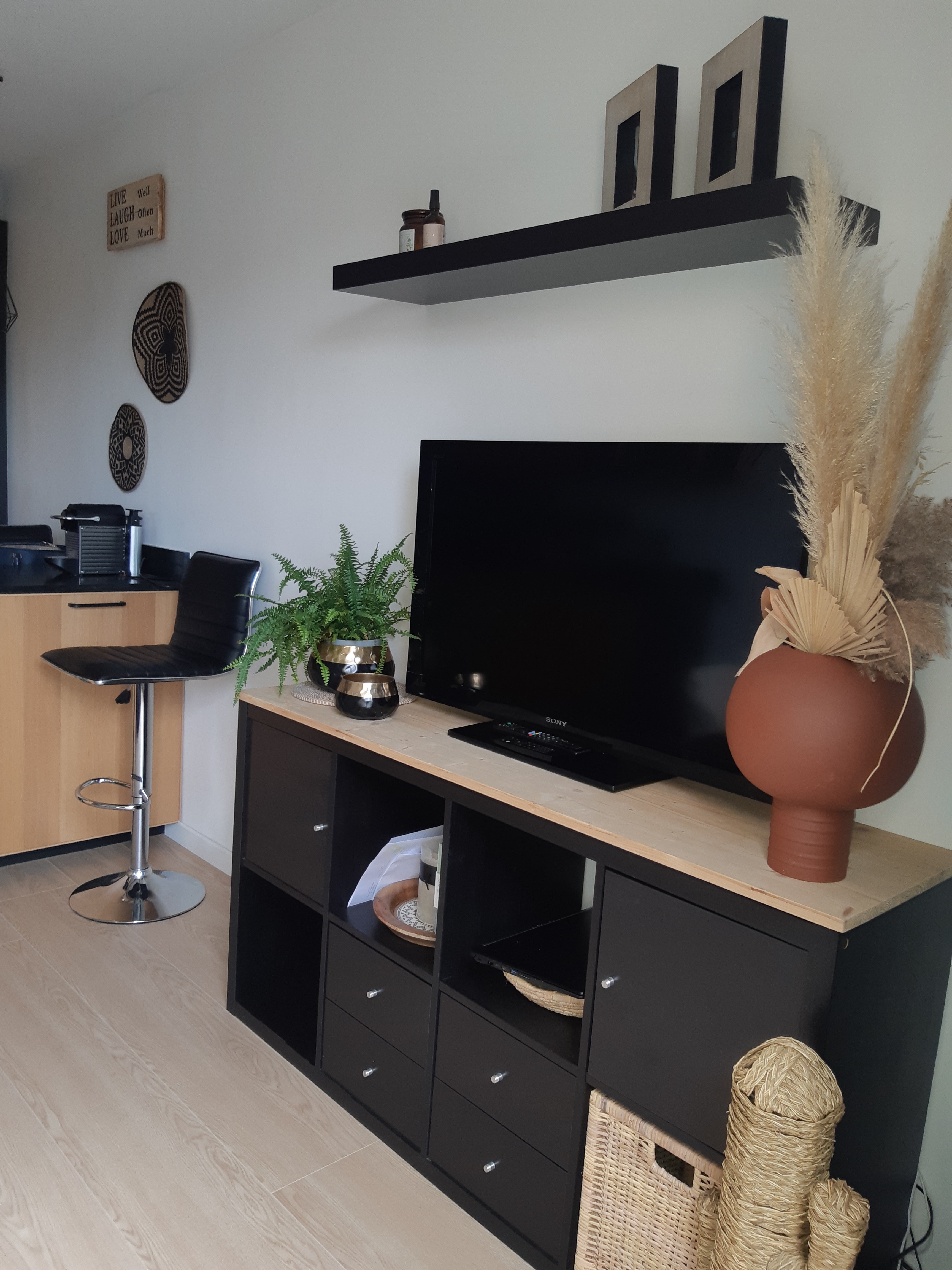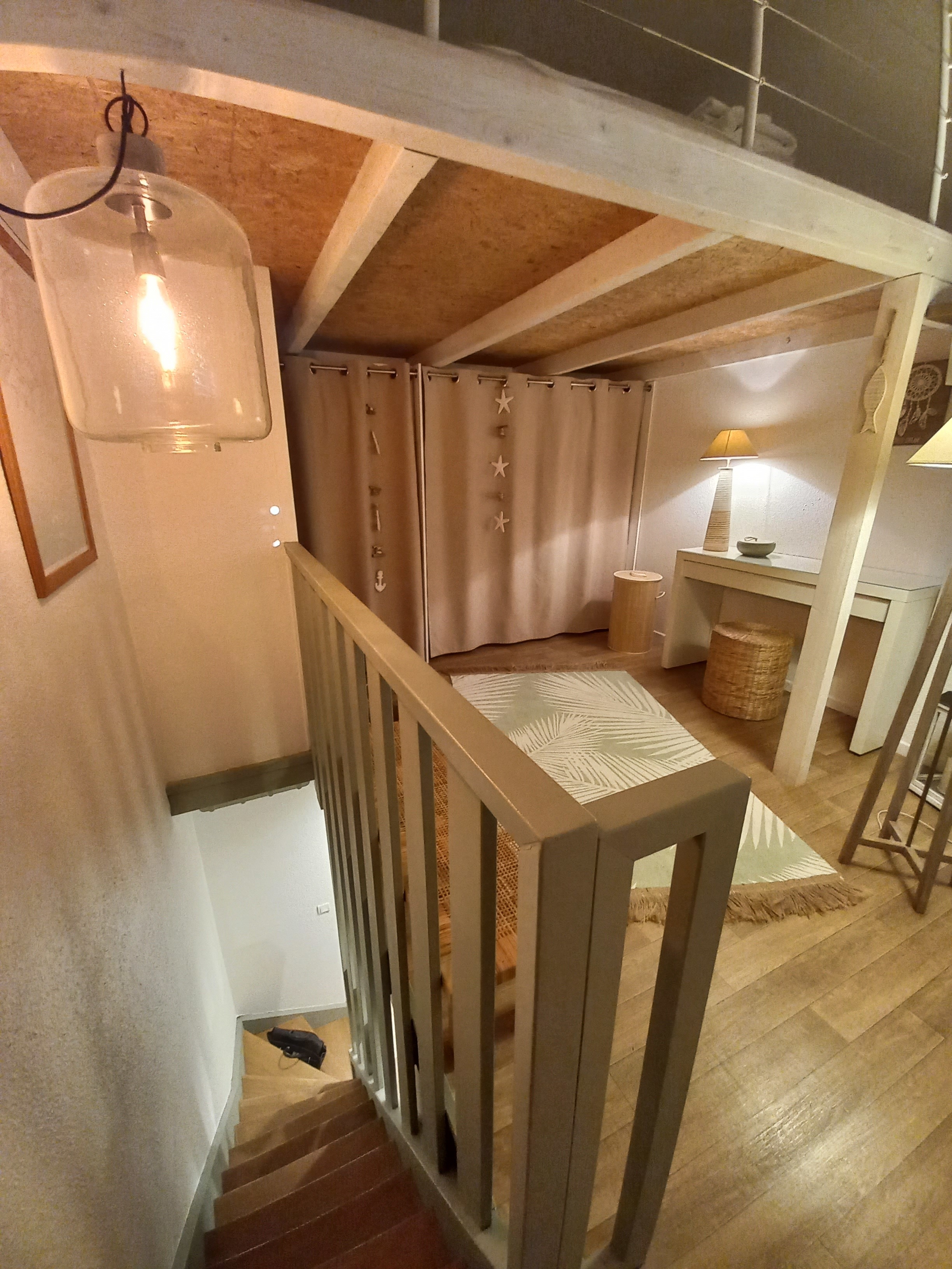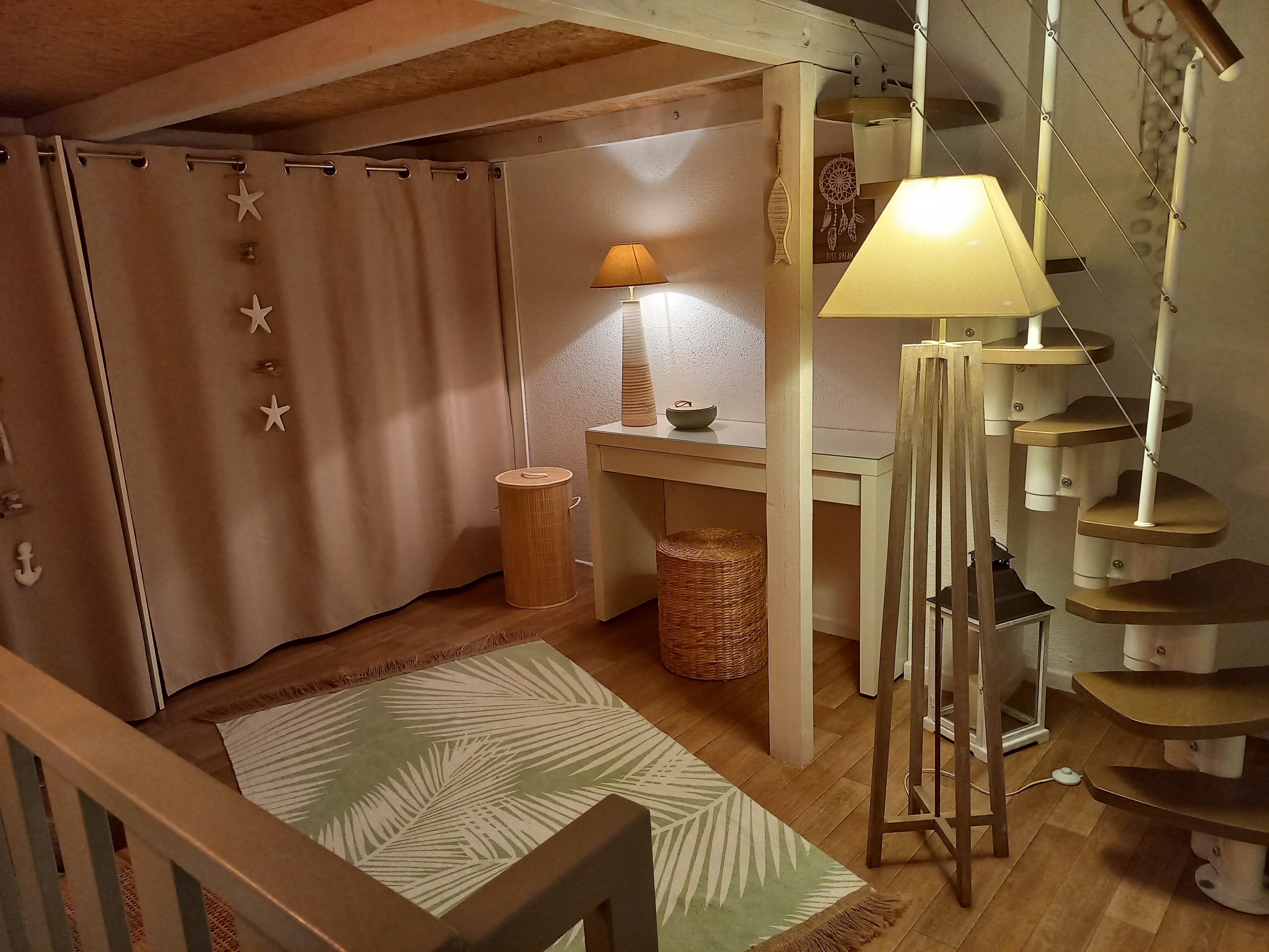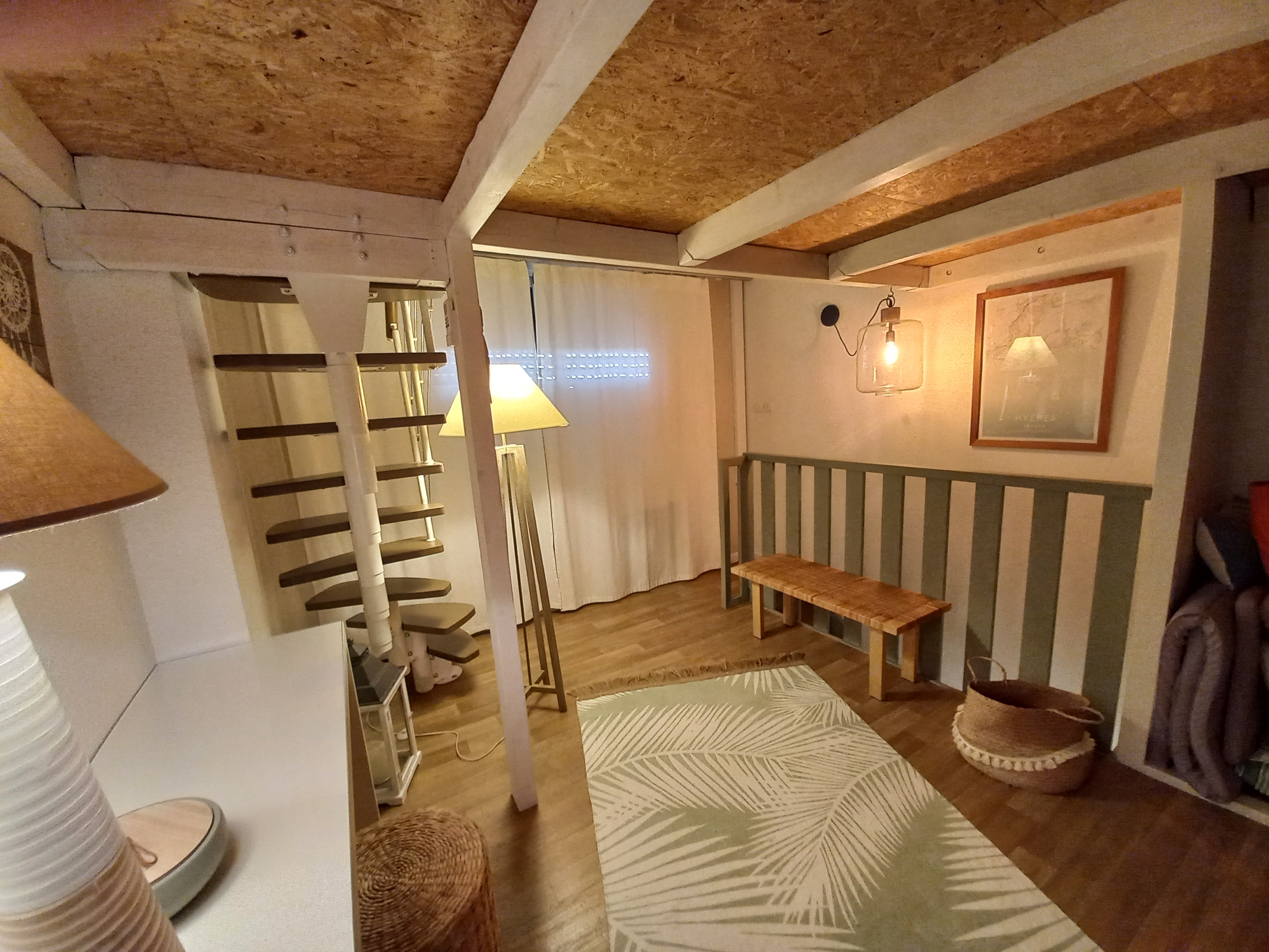L'appartamento è composto da un ingresso, una cucina nuova e molto ben attrezzata (piano cottura a induzione, cappa aspirante, lavastoviglie, frigorifero, congelatore e lavatrice, tostapane, bollitore, macchina da caffè Nespresso) con un'isola centrale, un soggiorno con divano letto e televisione, che si apre su una terrazza di 9 m². Da questo livello si accede al bagno con vasca e WC. Una scala conduce al piano superiore, dove si trova una camera da letto soppalcata con letto di 1,40 m, comodini, cassettiera e televisore, nonché un ampio spogliatoio con scrivania, che si apre su un solarium di 14 m². L'appartamento è climatizzato!