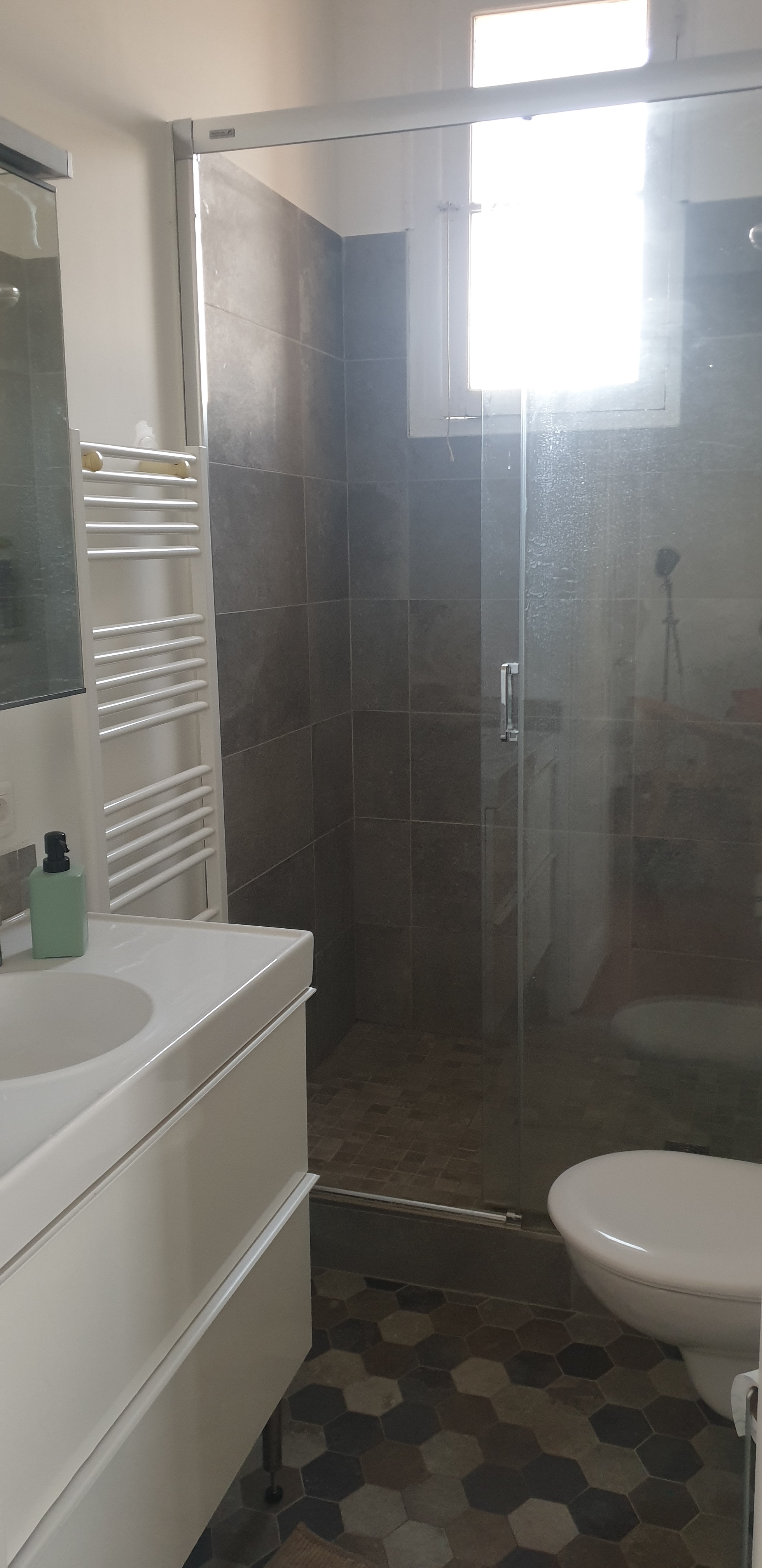 Bagno con doccia / WC: grande doccia con schermo, lavandino con lavabo, portasciugamani, asciugacapelli.