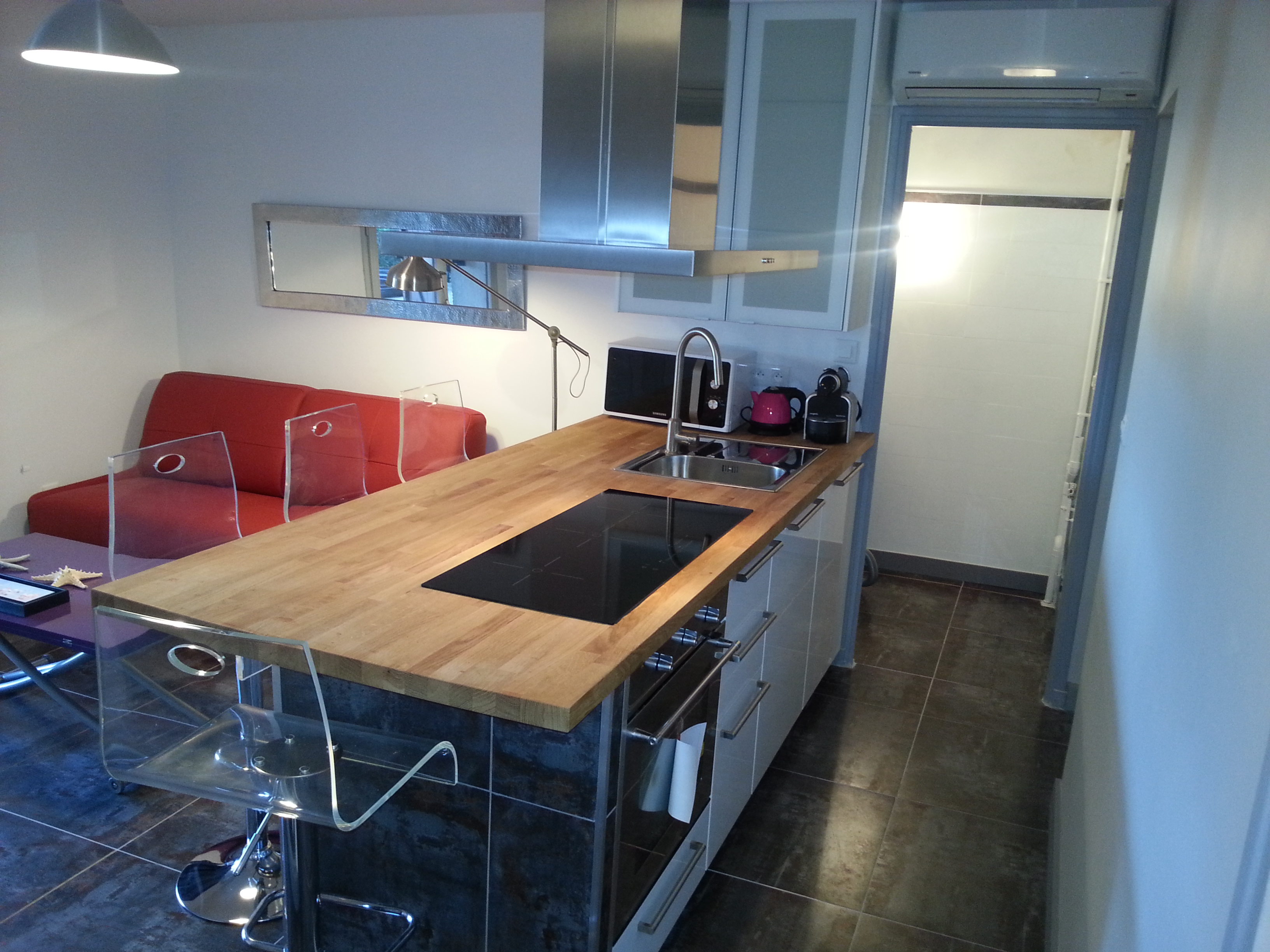 Appartamento di 55 m2 a pochi minuti a piedi da spiagge e calette. 1 grande camera da letto, 1 salotto, 1 soggiorno, cucina a vista, bagno, WC. Piscina privata a sfioro riscaldata.