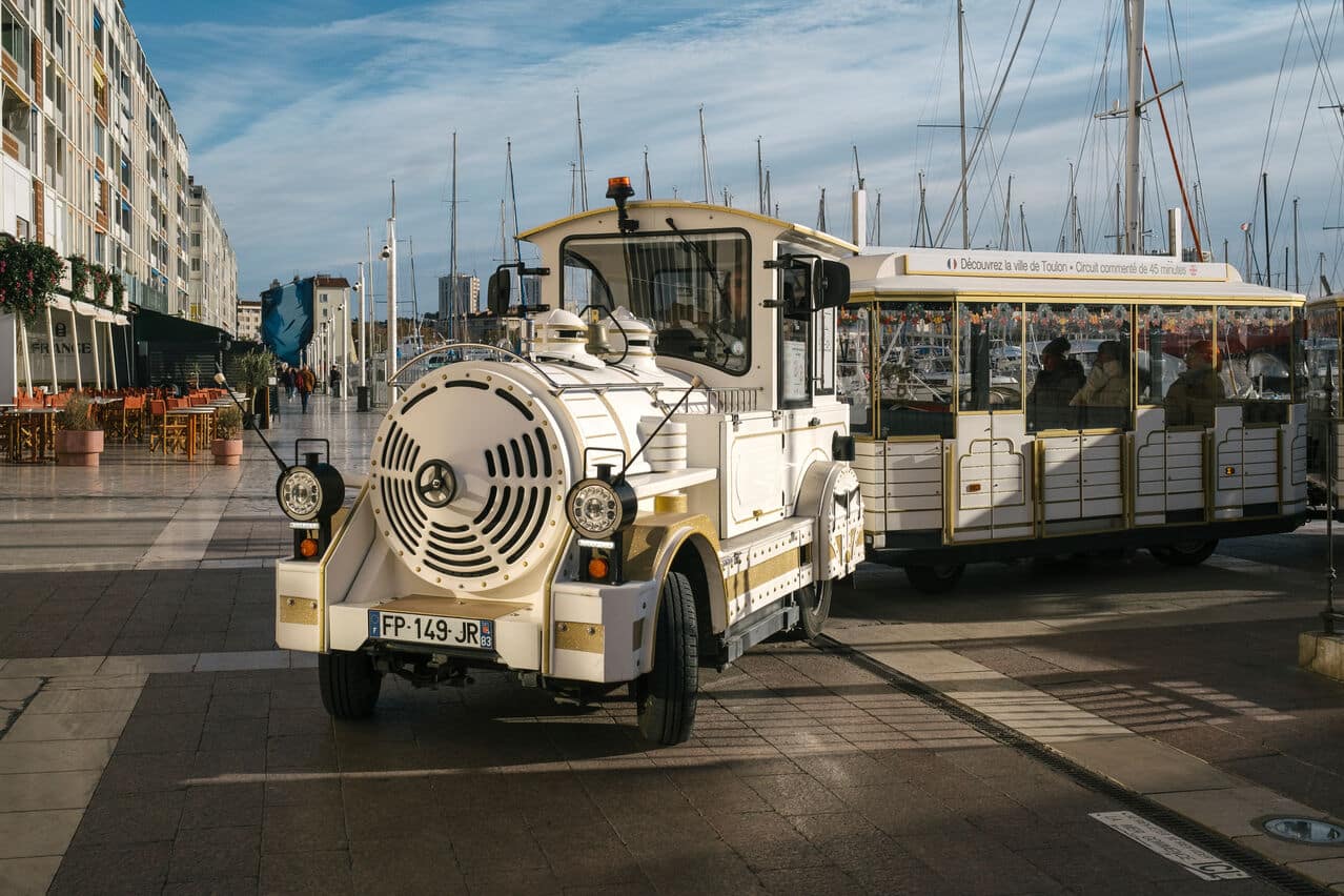Embarquez à bord du petit train de Toulon pour une visite commentée qui vous fera parcourir le port, longer la rade et découvrir le fort Saint-Louis ainsi que les plages et les jardins du Mourillon.